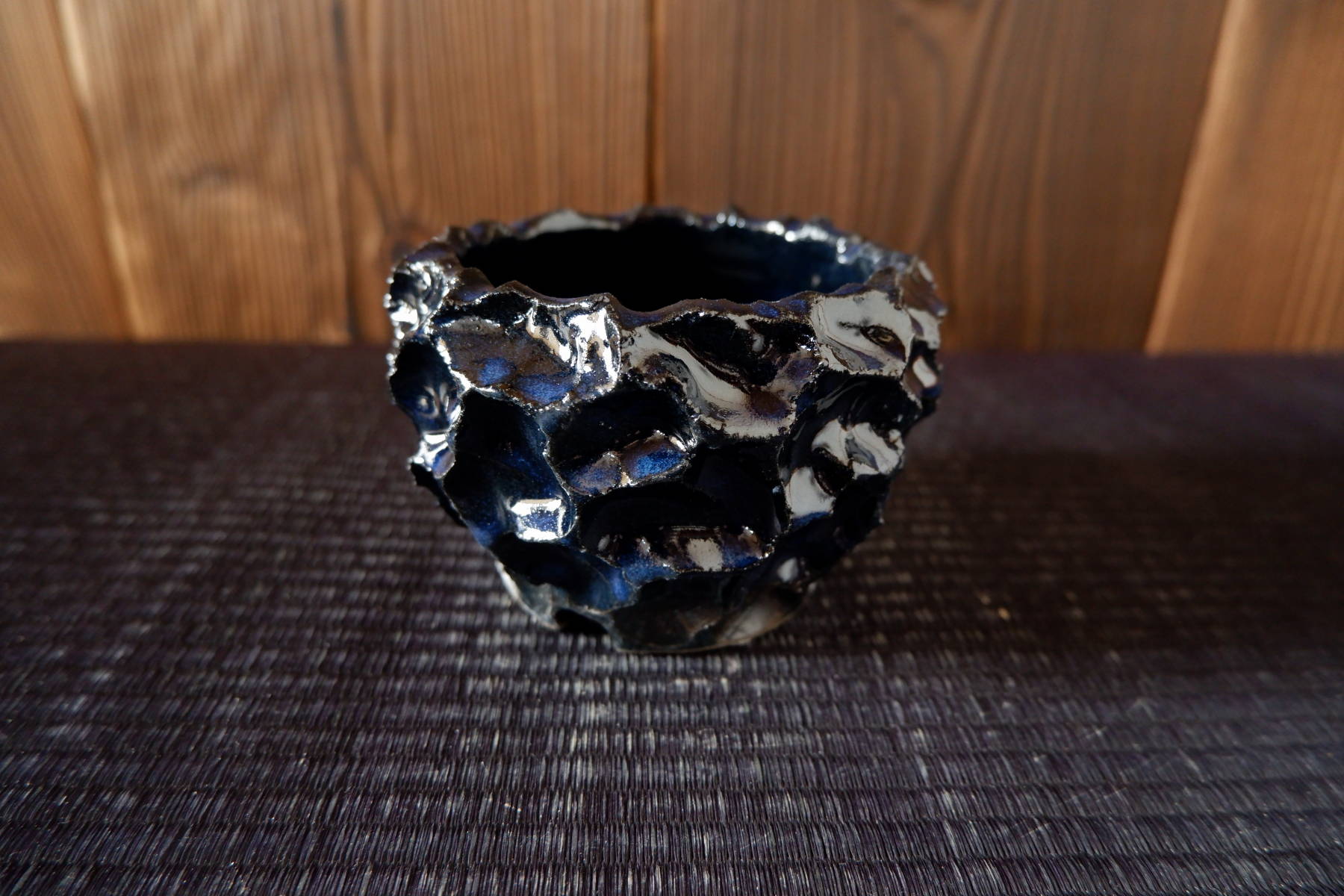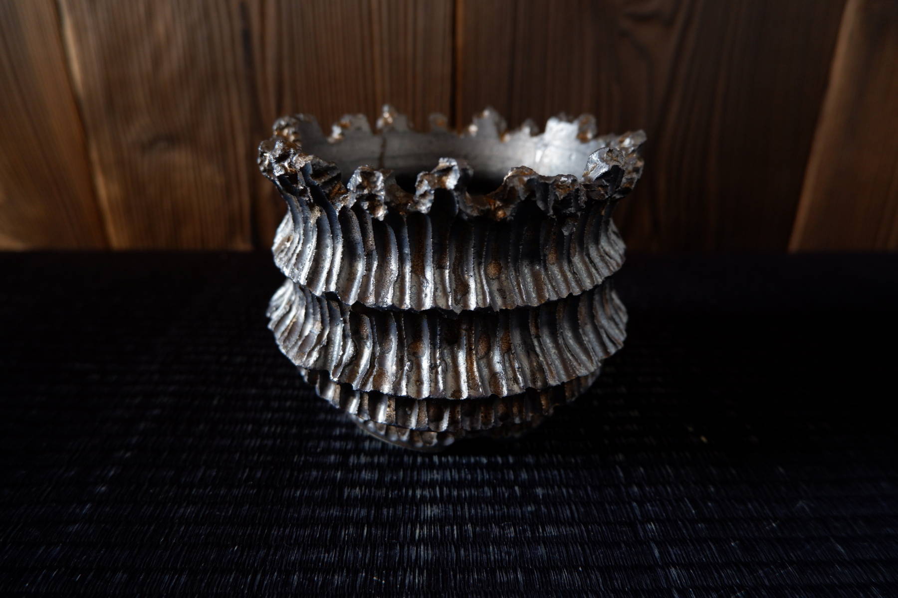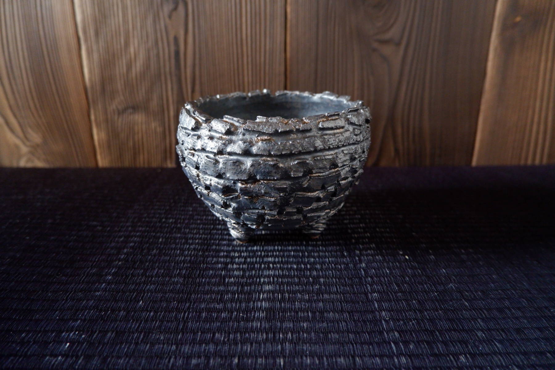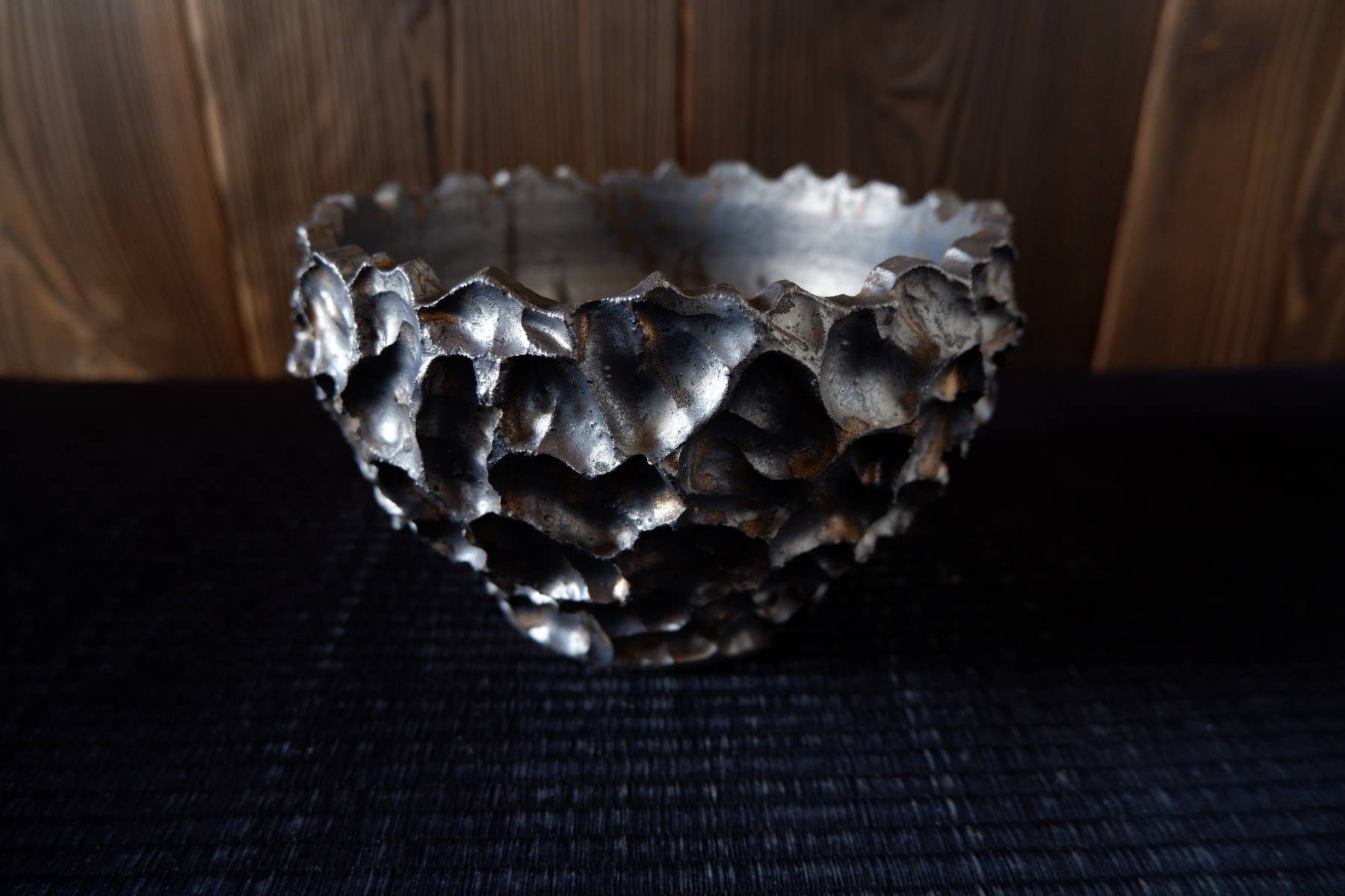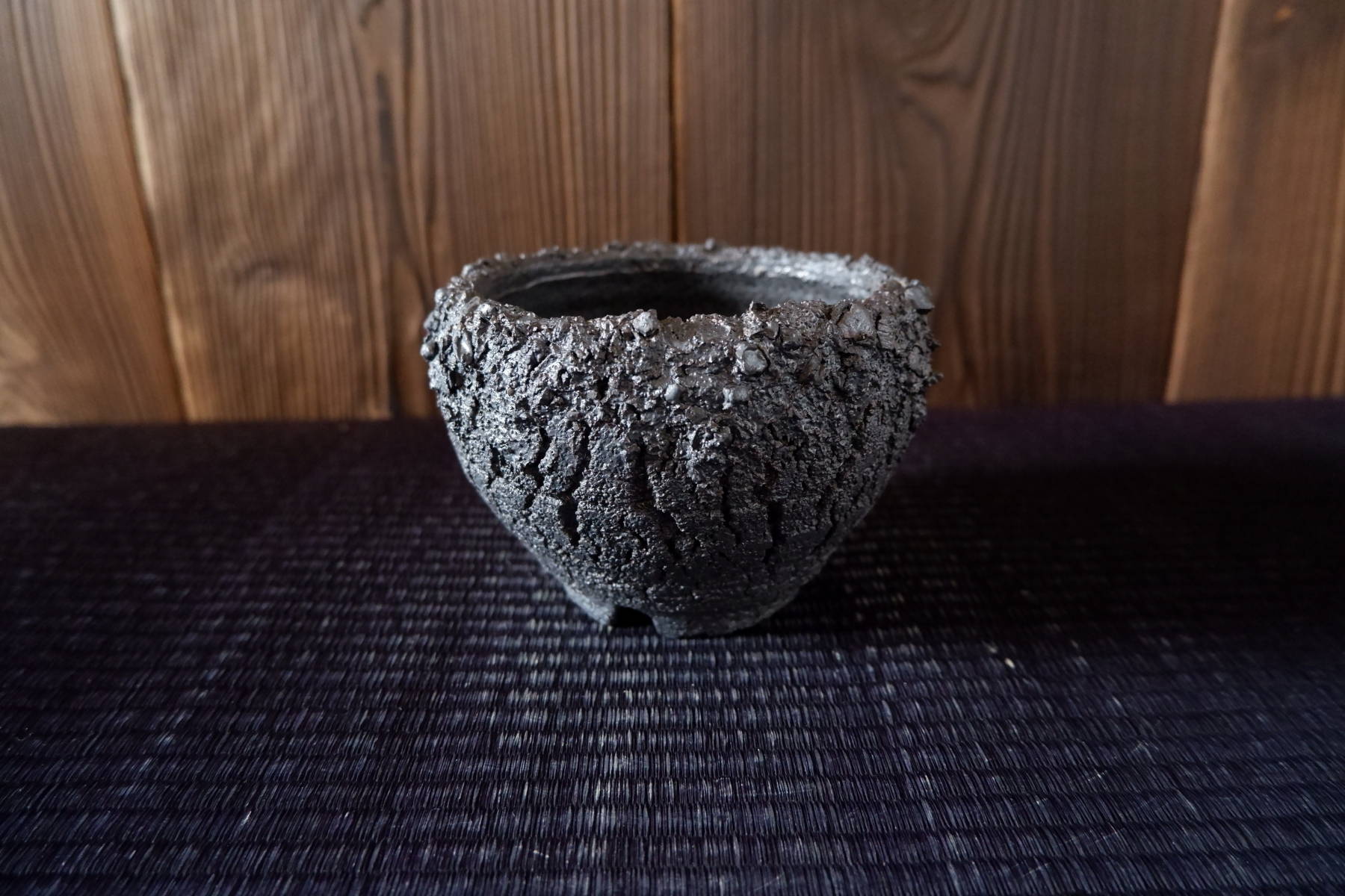 溝の凹凸が顕著な荒裂紋と荒深彫りの鉢で作りました。