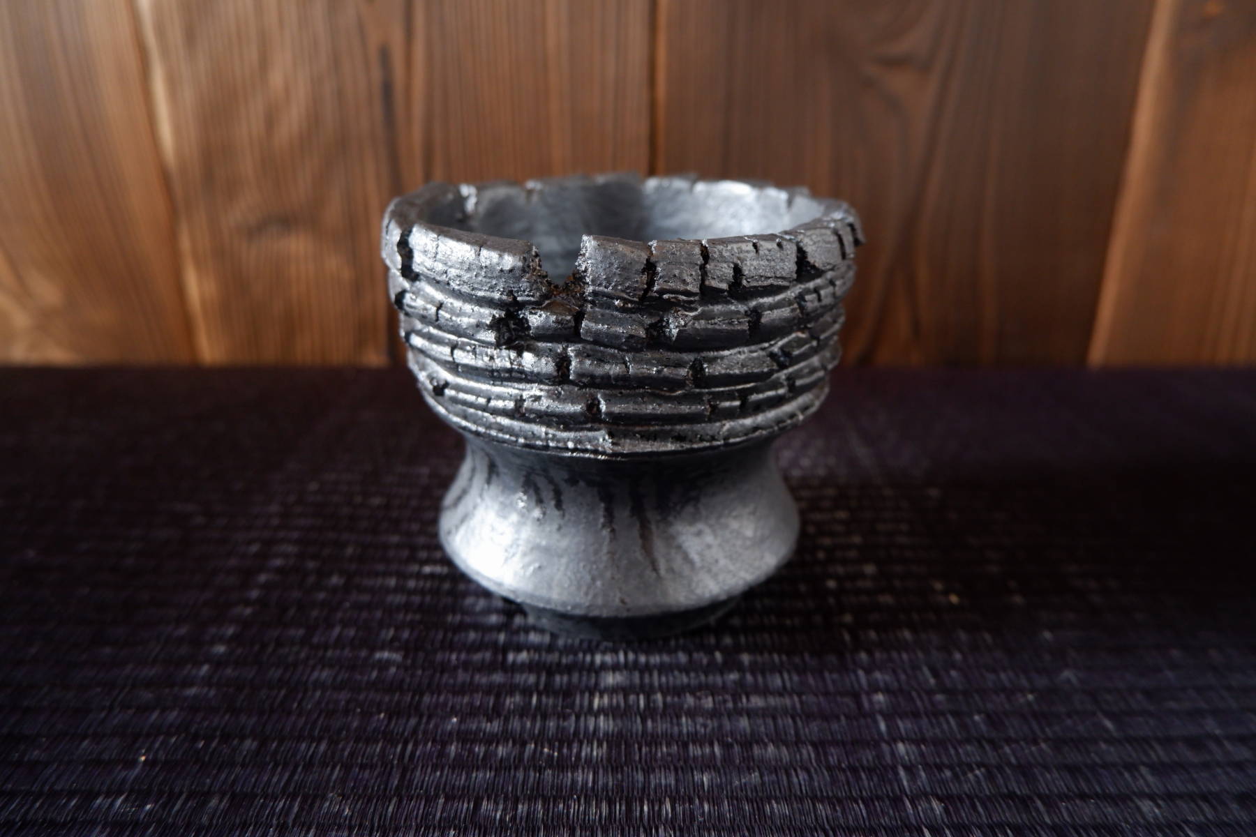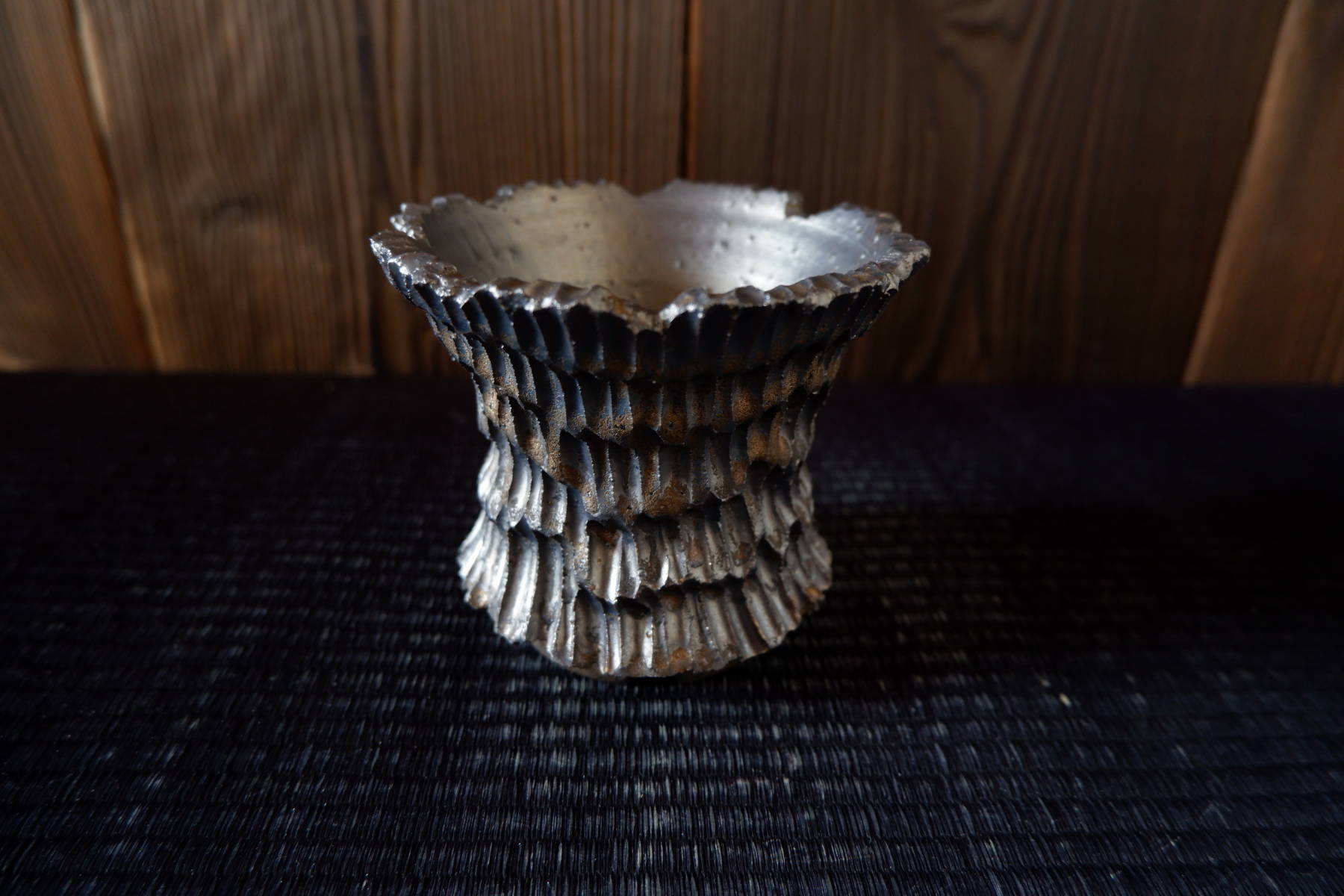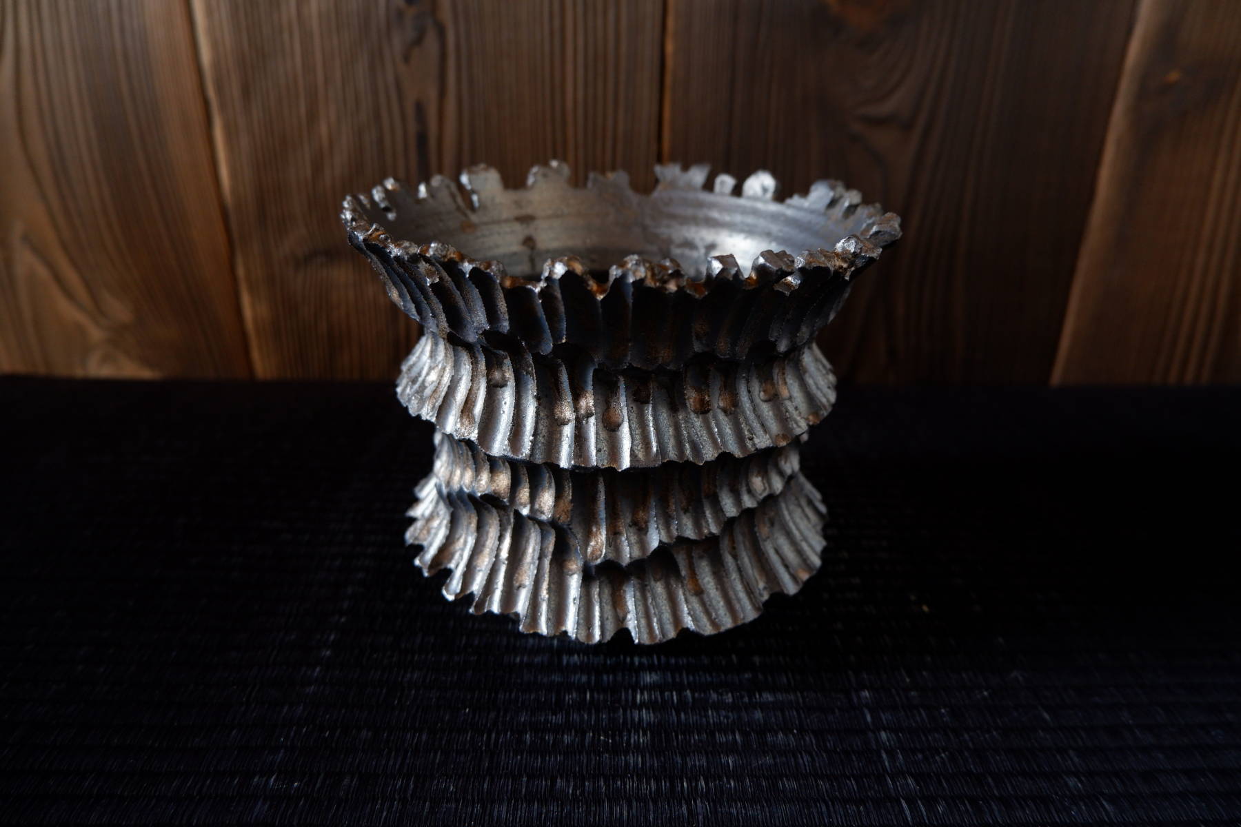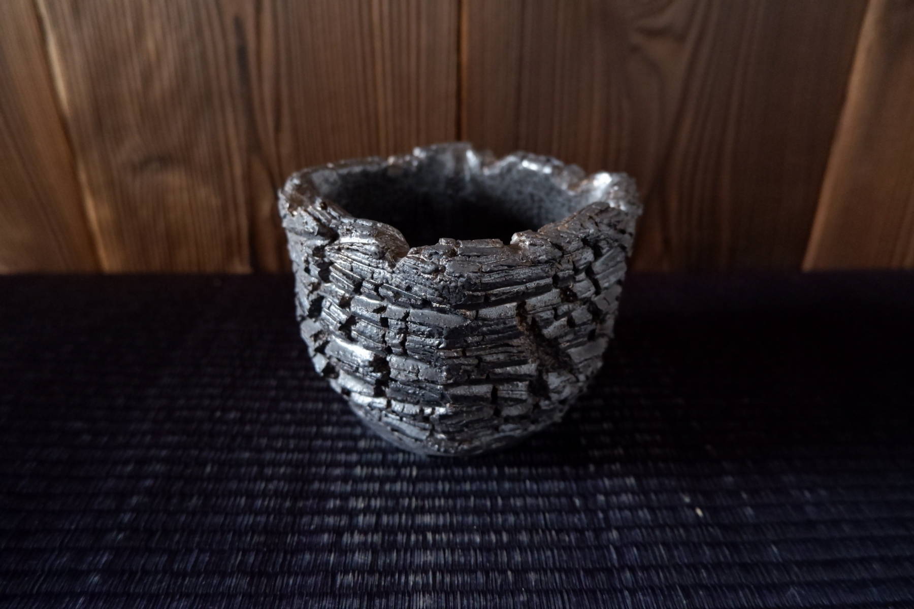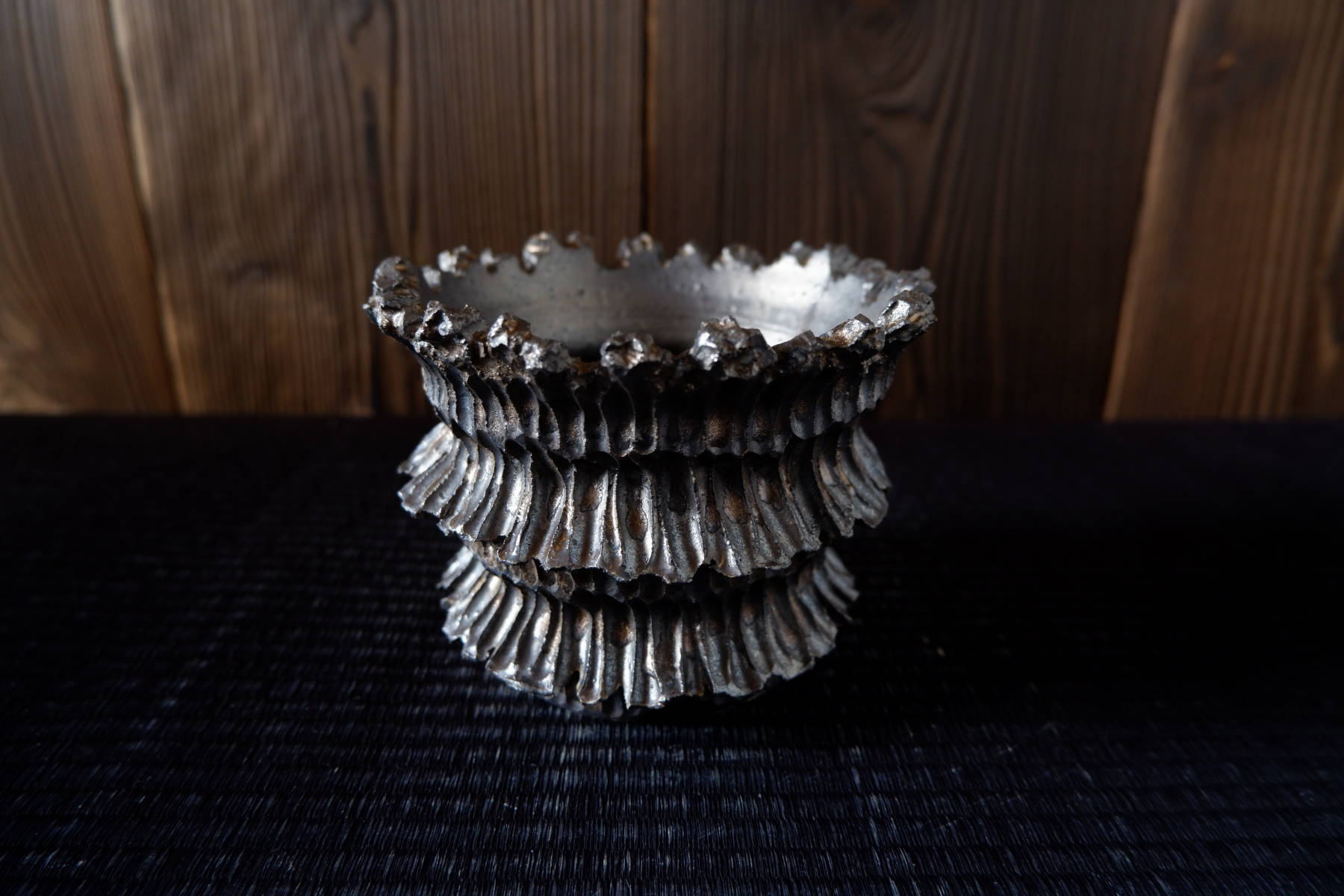 溝の凹凸が顕著な荒裂紋と荒深彫りの鉢で作りました。