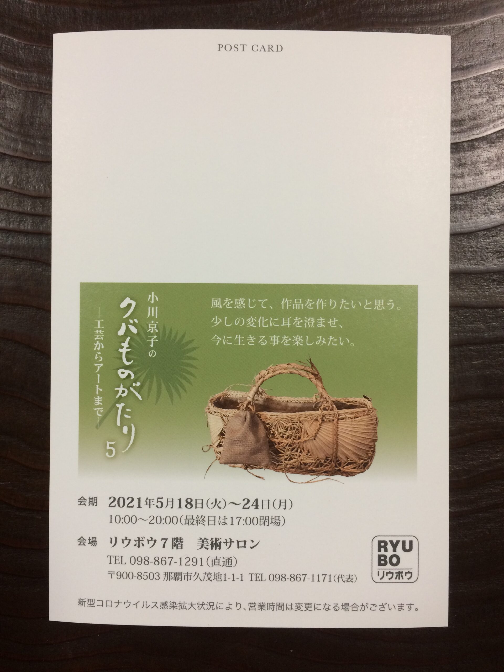 クバといえばクバオージ(クバ扇)しか知りませんでしたが、手提げ籠、カバン、花入れ、お盆、小物などの他、インテリアオブジェなど、布地と組み合わせたものまで、展示会の案内にもあるように「工芸からアートまで」の作品を拝見できました。