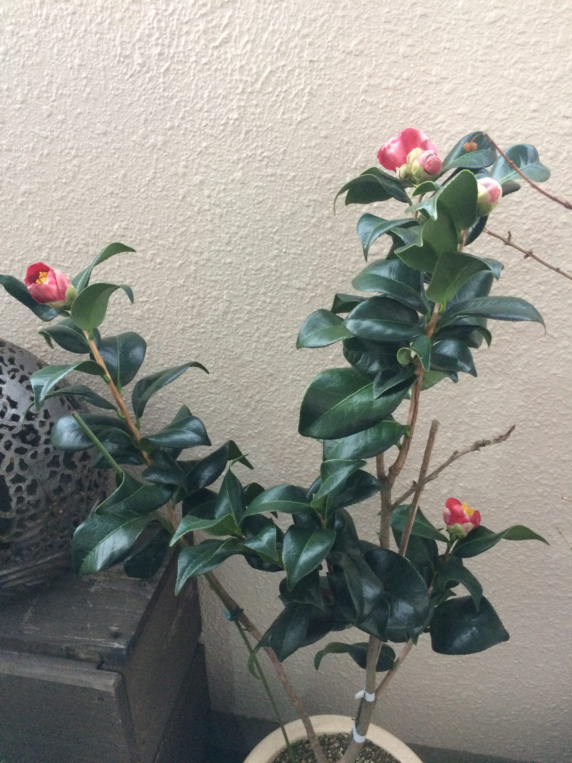 今年はベランダの椿が今までで一番多く蕾を着けていて、日に日にふっくらと開いてきました。
