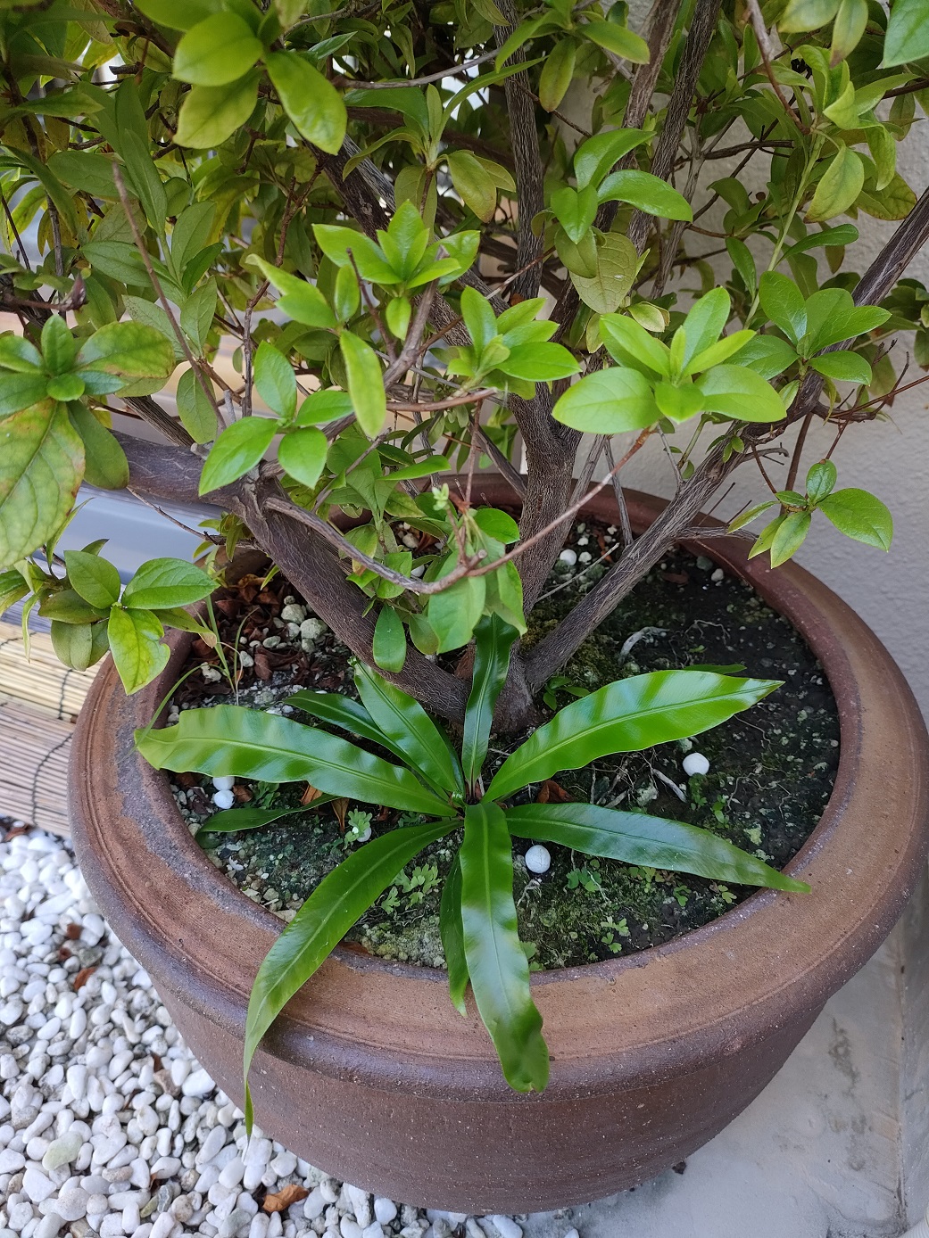 何処からか、何時からか分かりませんが、ベランダの慶良間ツツジの大鉢の中でヒッソリと大きくなっていた、オオタニワタリ。