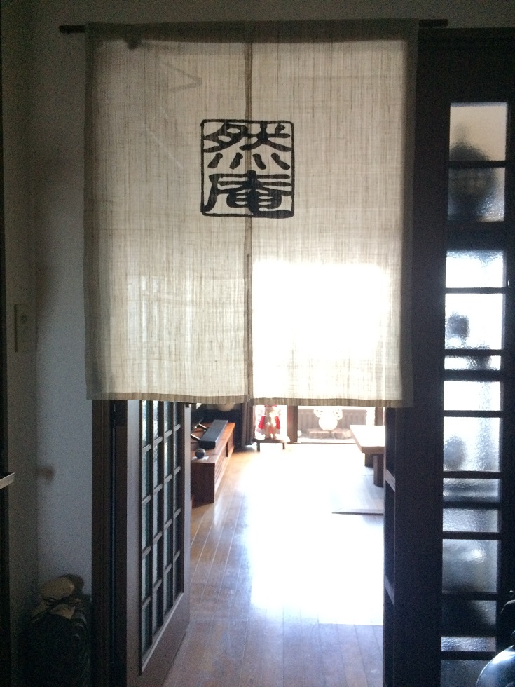 我が家の玄関とリビングの間用に、弊工房のロゴを染め抜いた短めの生成の麻暖簾を作っていいただきました。