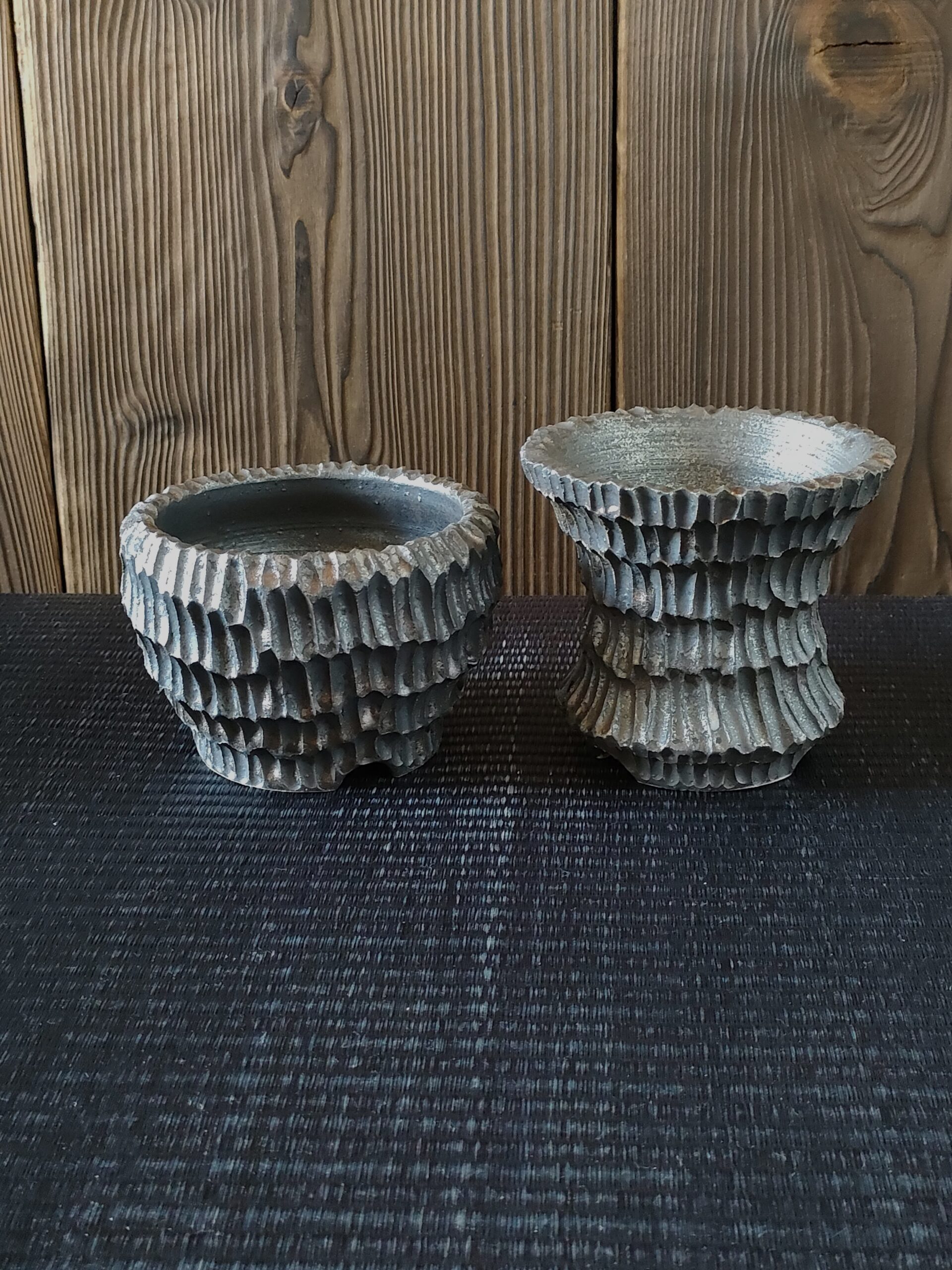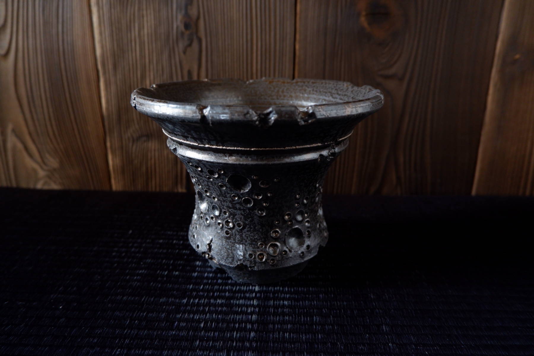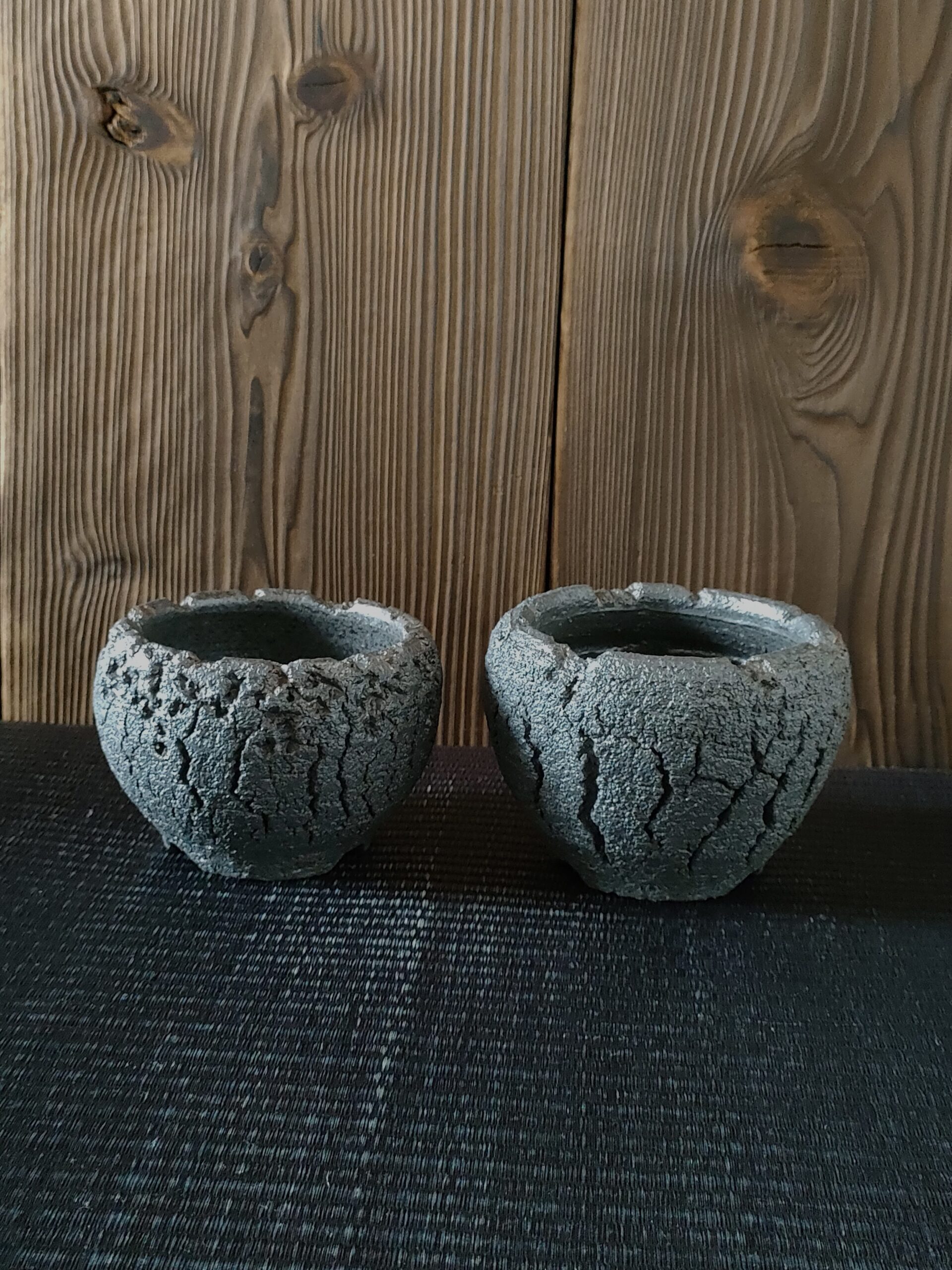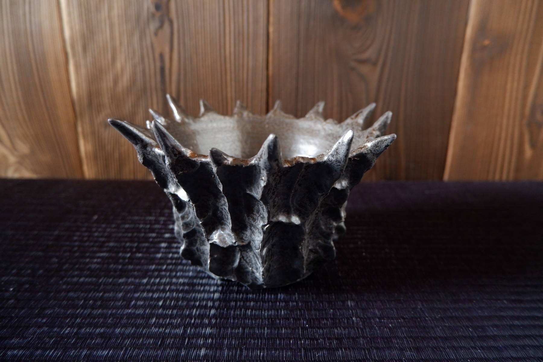 側面の月面のような凹みと縁のクラック模様を組み合わせた鉢は、黒金彩釉と鉄砂黒釉を一つずつ。