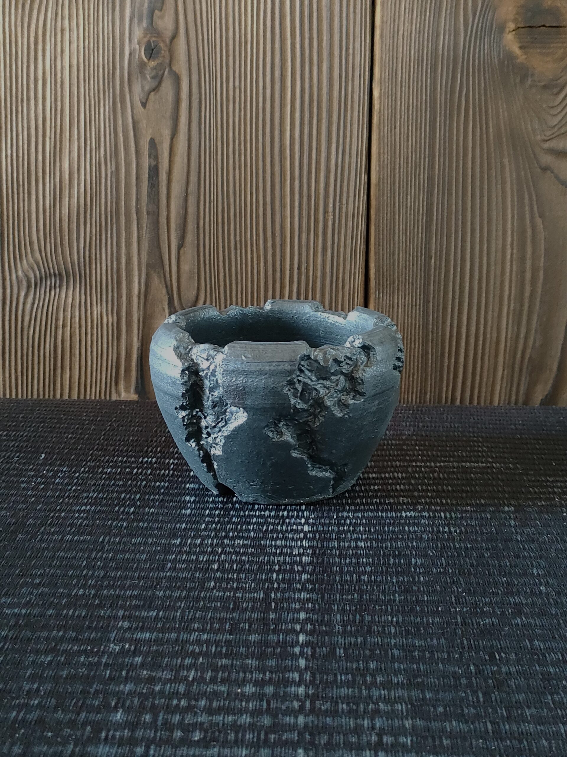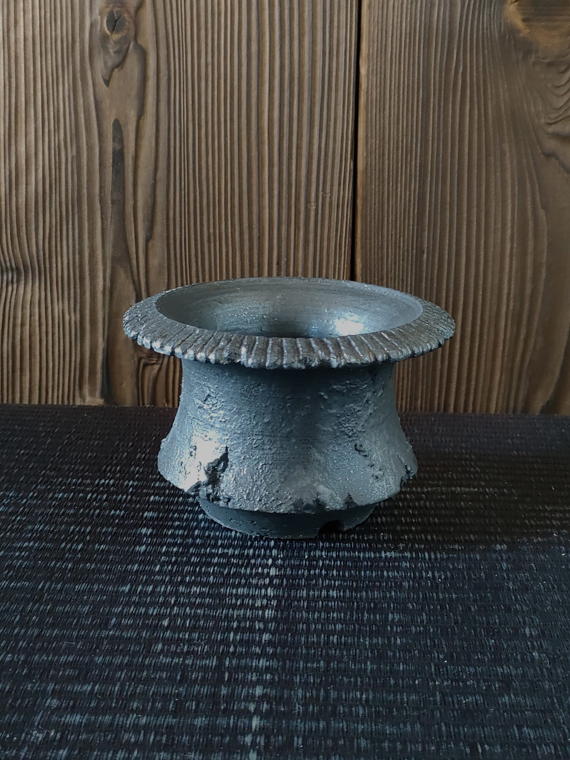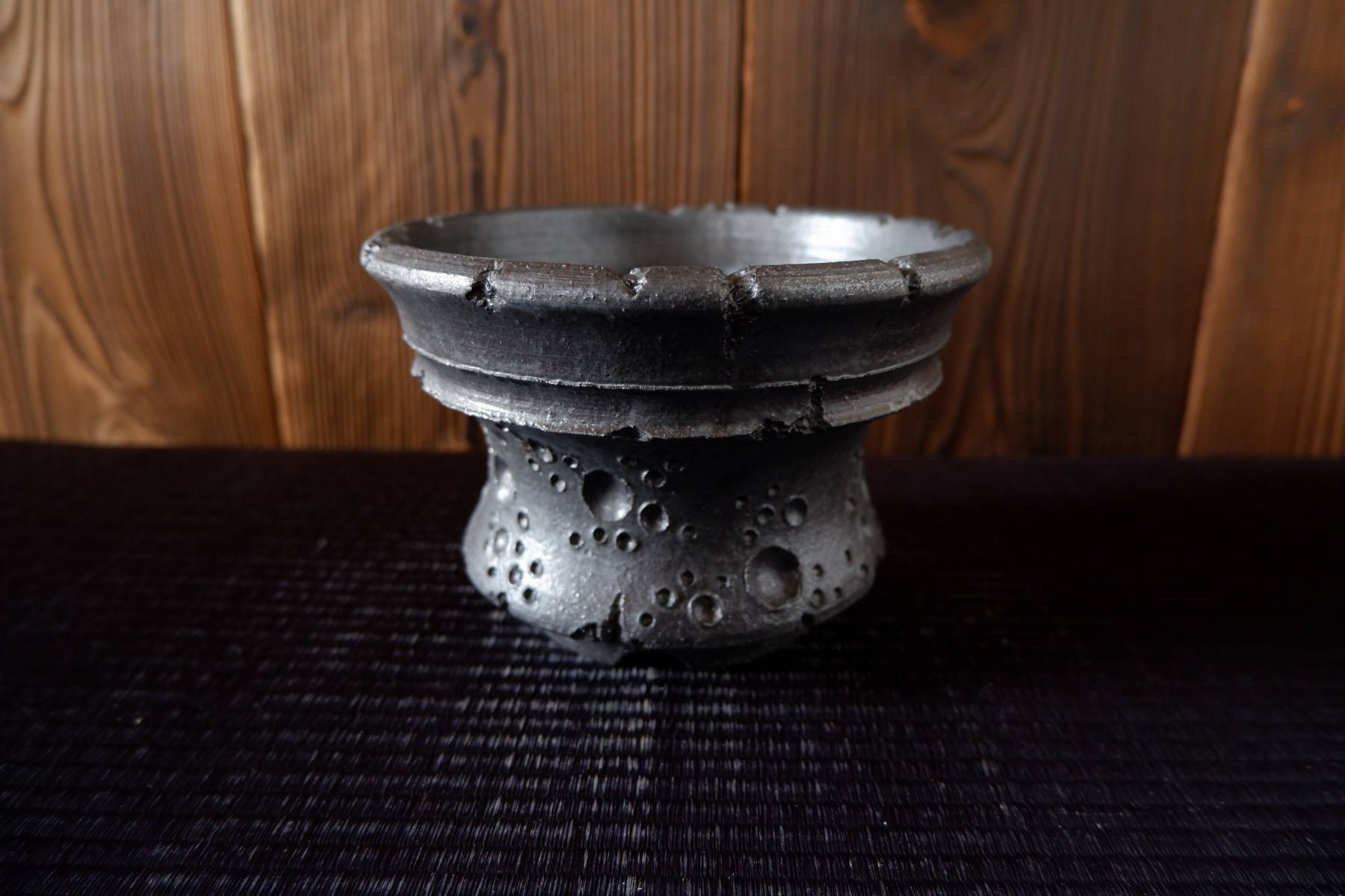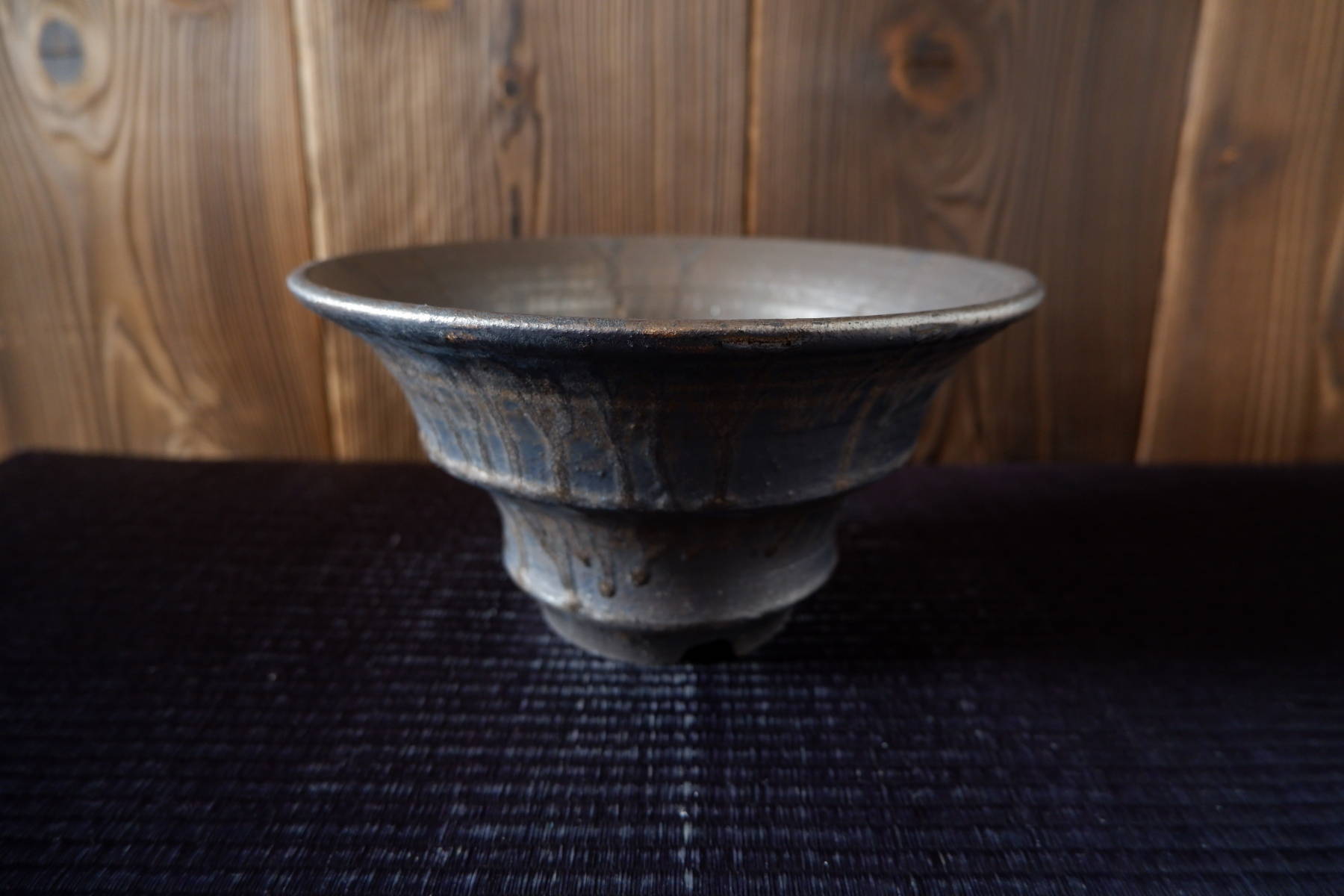 側面の月面のような凹みと縁のクラック模様を組み合わせた鉢は、黒金彩釉と鉄砂黒釉を一つずつ。