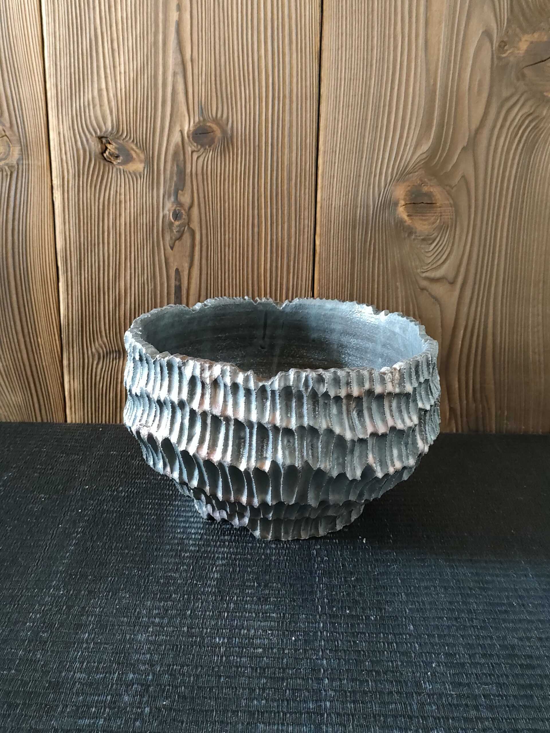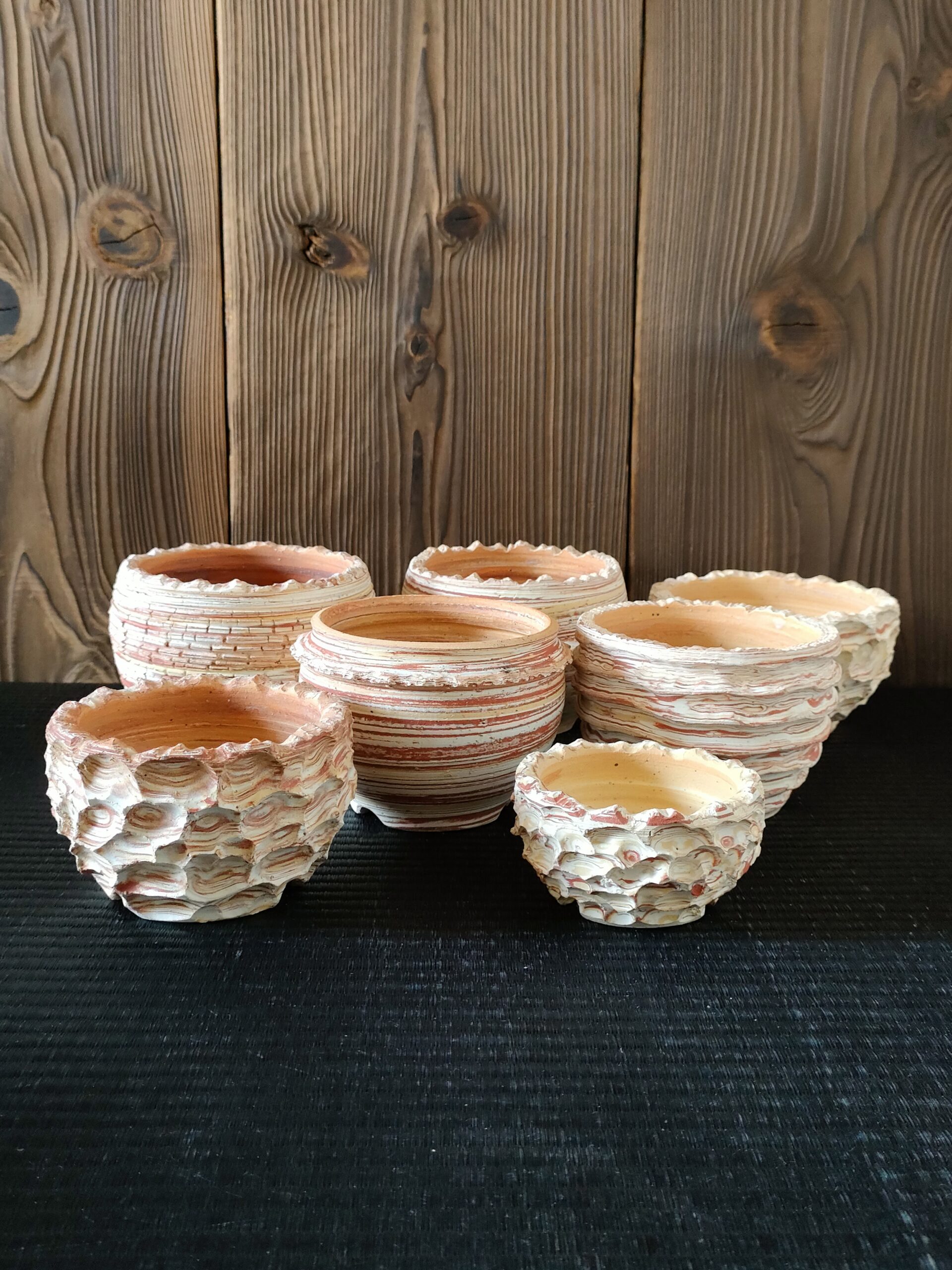 今回は、いつも以上に厚めに轢いて、より深く、より大胆に彫り込み、削り出した5号鉢、白い珊瑚土をベースに赤土と黄土を練り込んだ三色層の練り込み鉢、大きめの平鉢などです。