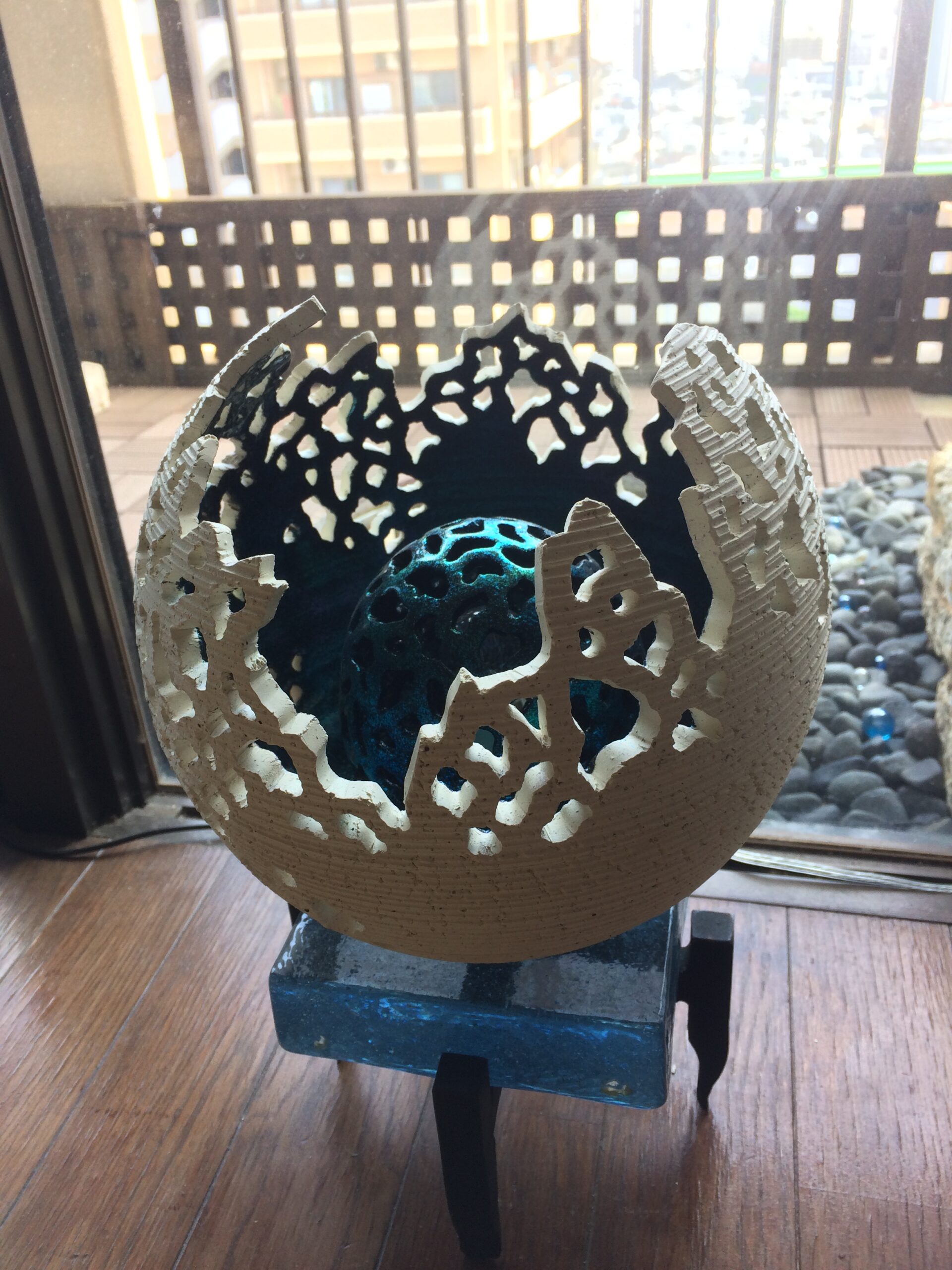 まだ上手く焼き上がるか分かりませんが、作品としては、花器や香炉としてだけでなく、月の形を3Dプリンターで再現した市販の「月のライト」とそれを乗せる台を作って、ランプとしてご提案したいと思っています。