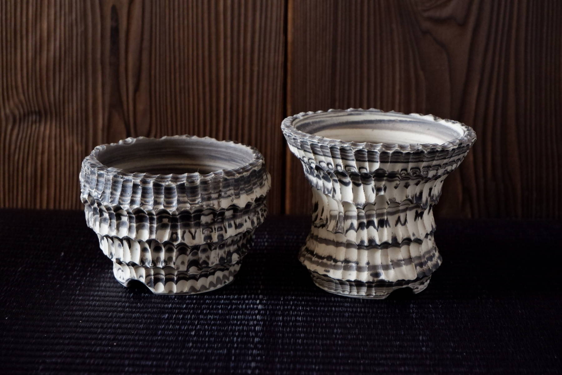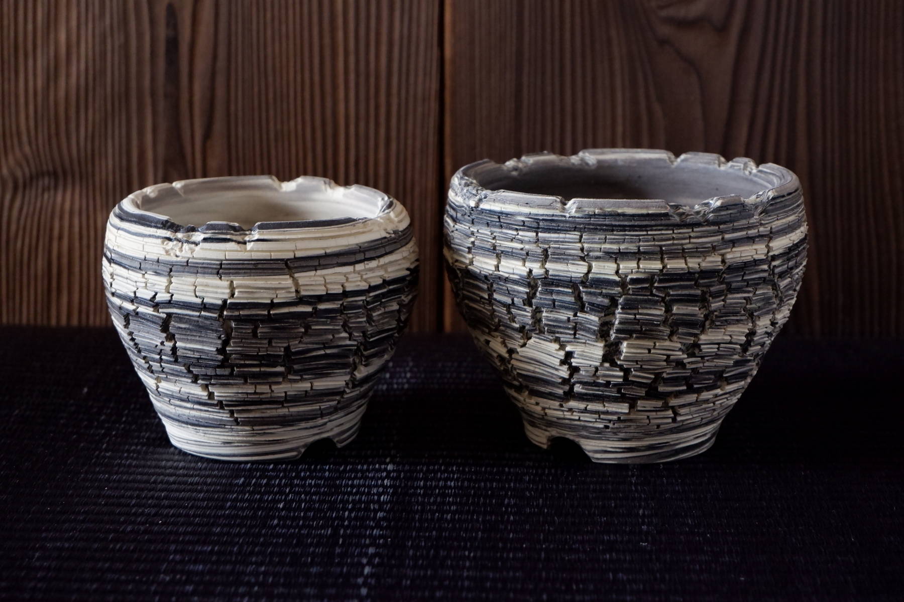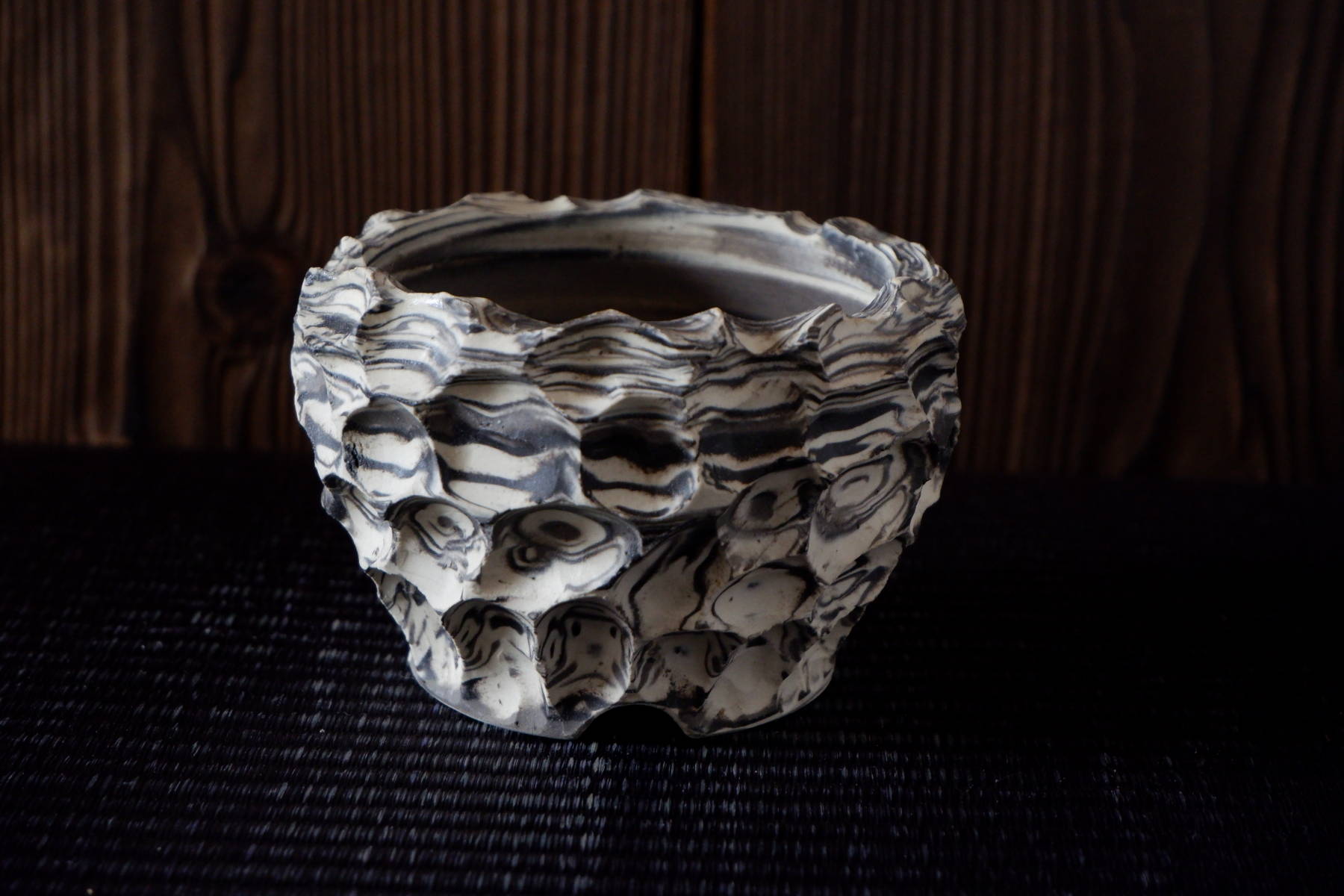 弊工房定番の白・黒・グレーの3色練り込み鉢は3種類。
