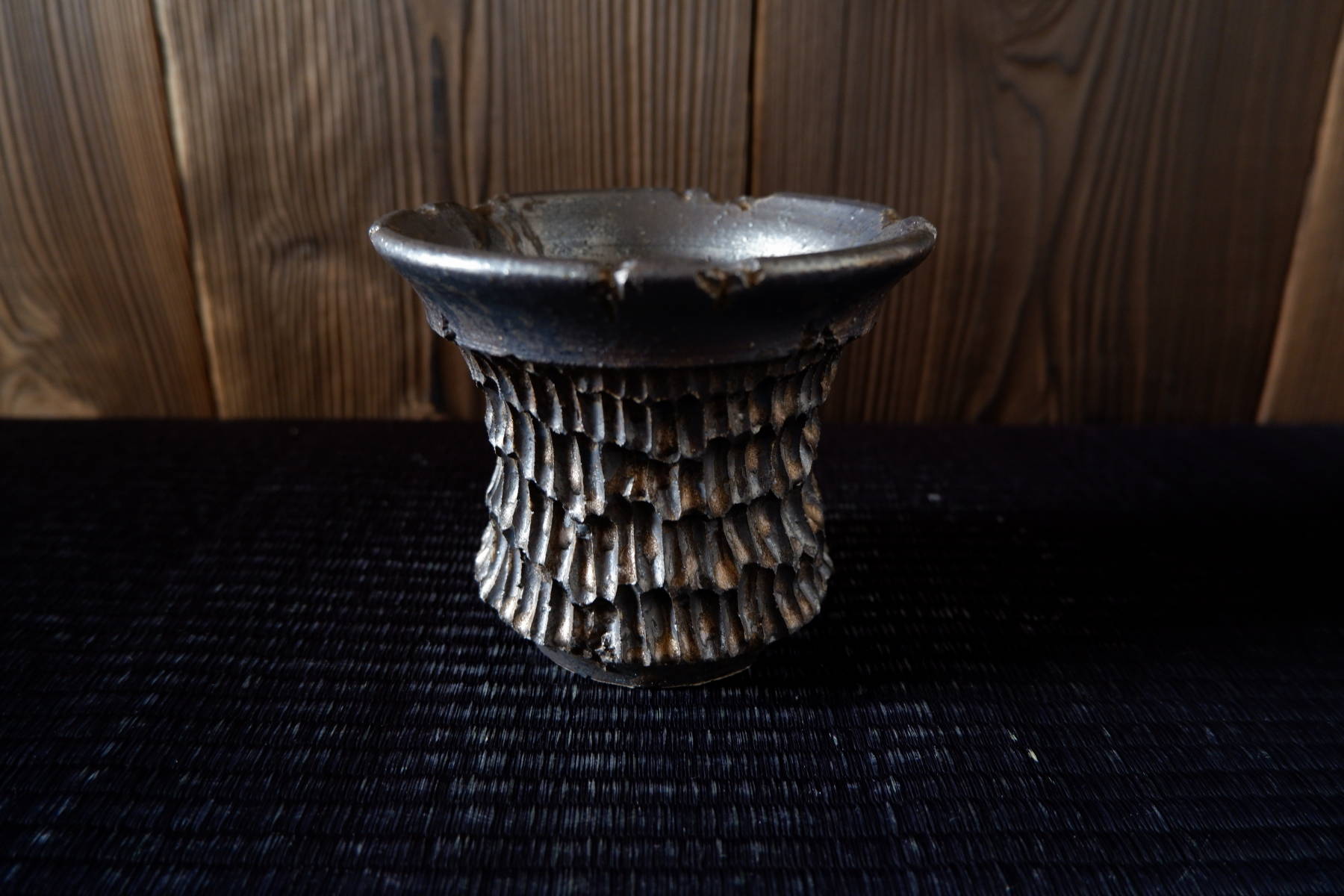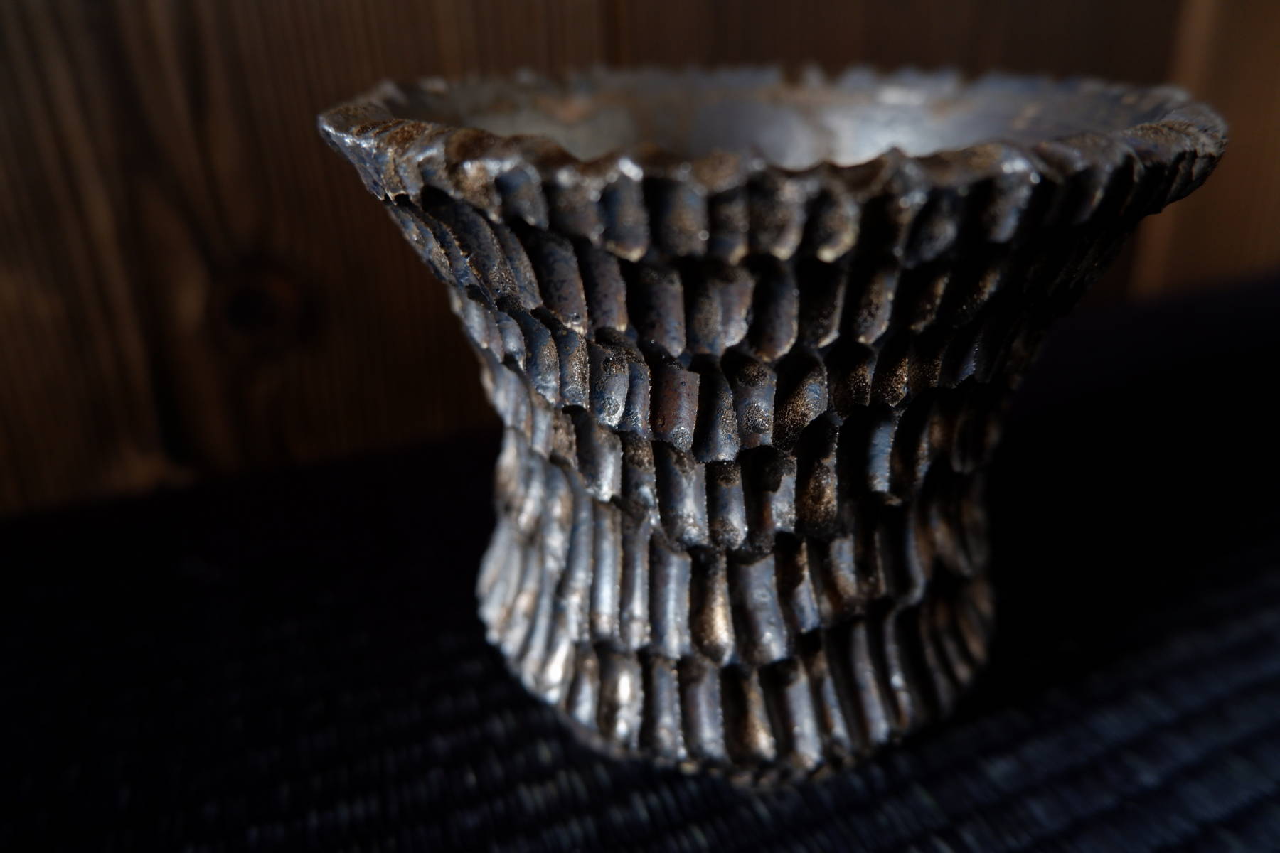 彫りももっと有機的な表情にしたくて、手捻り成形の歪みをそのままに彫りを入れました。