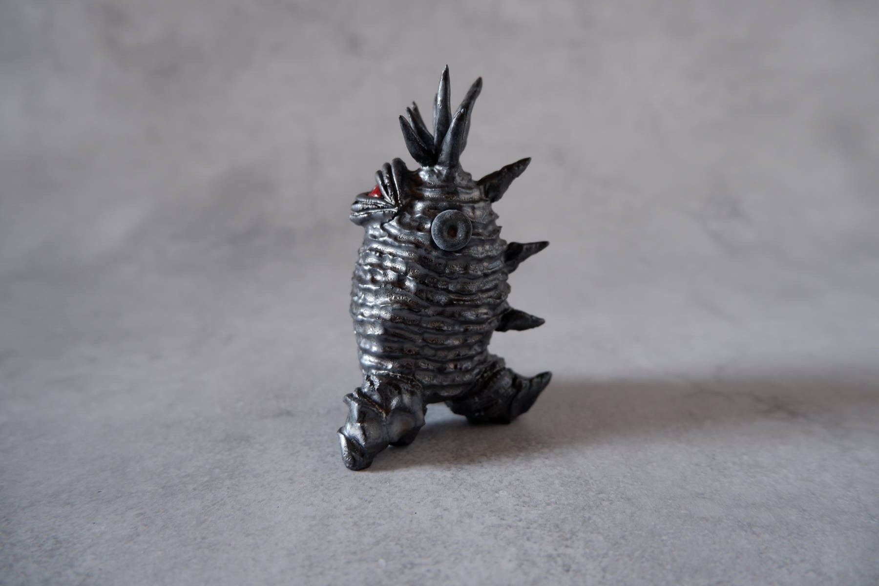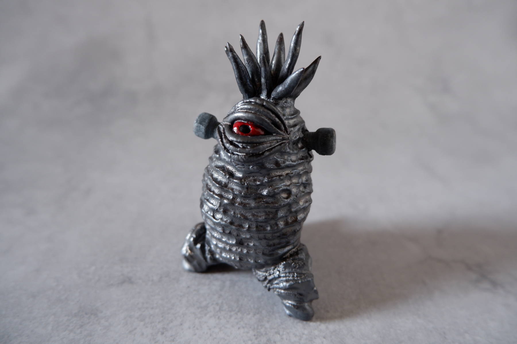 頭の両側から金属のボルトが打ち込まれているトサカ頭くん(ボルトは抜けません)。