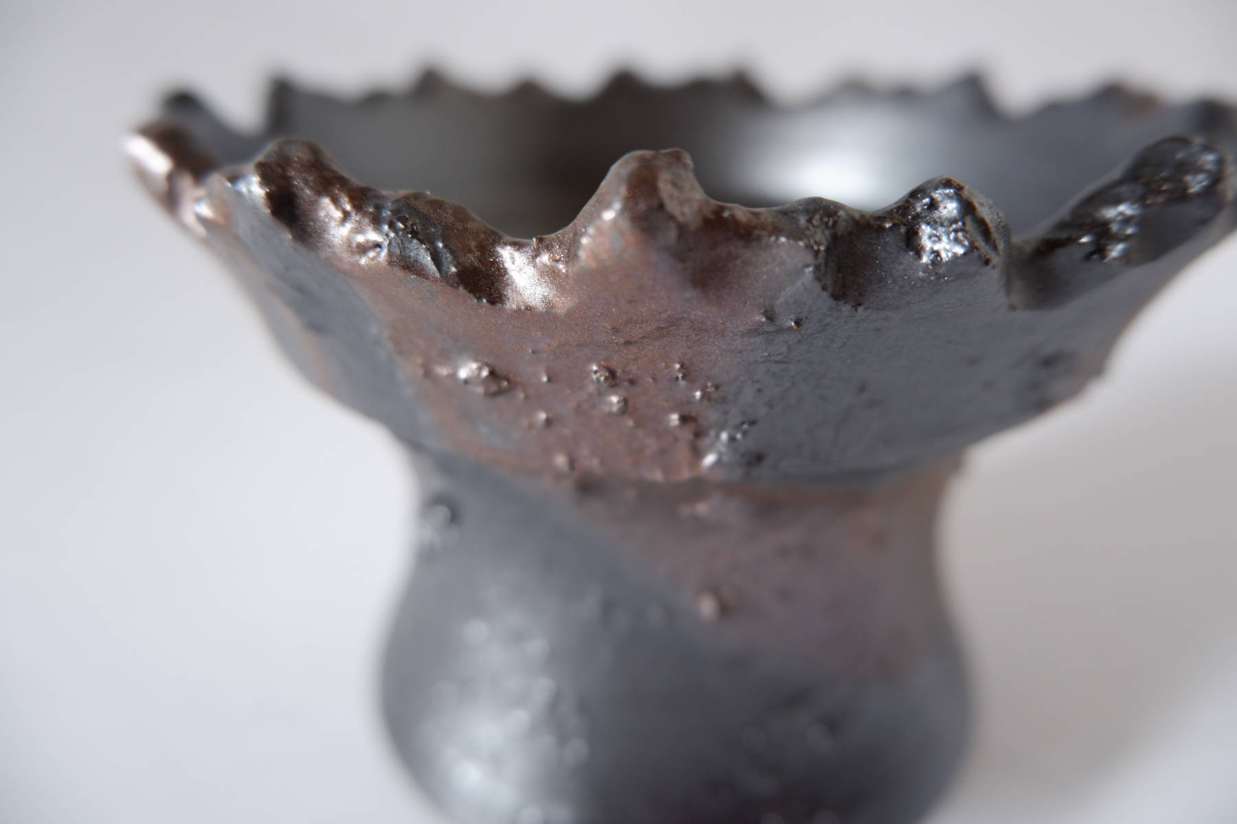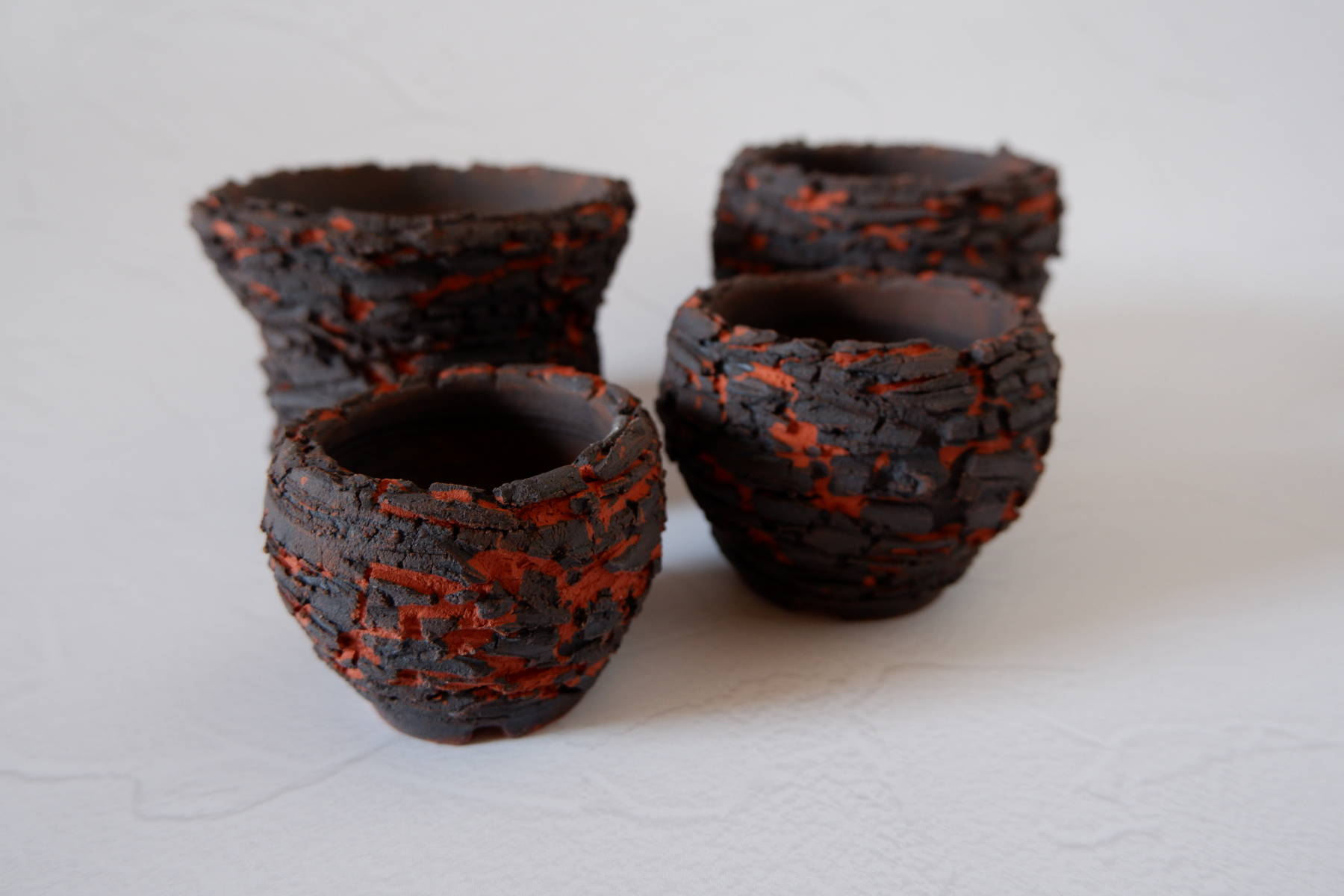「黒赤鬼」赤土に薄い黒釉をサッと掛けているので、所々で地の赤色が薄っすらと顔を出しています。