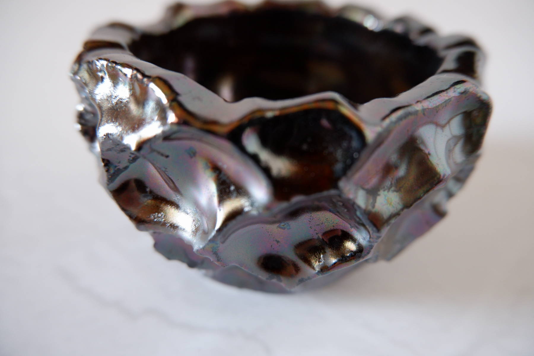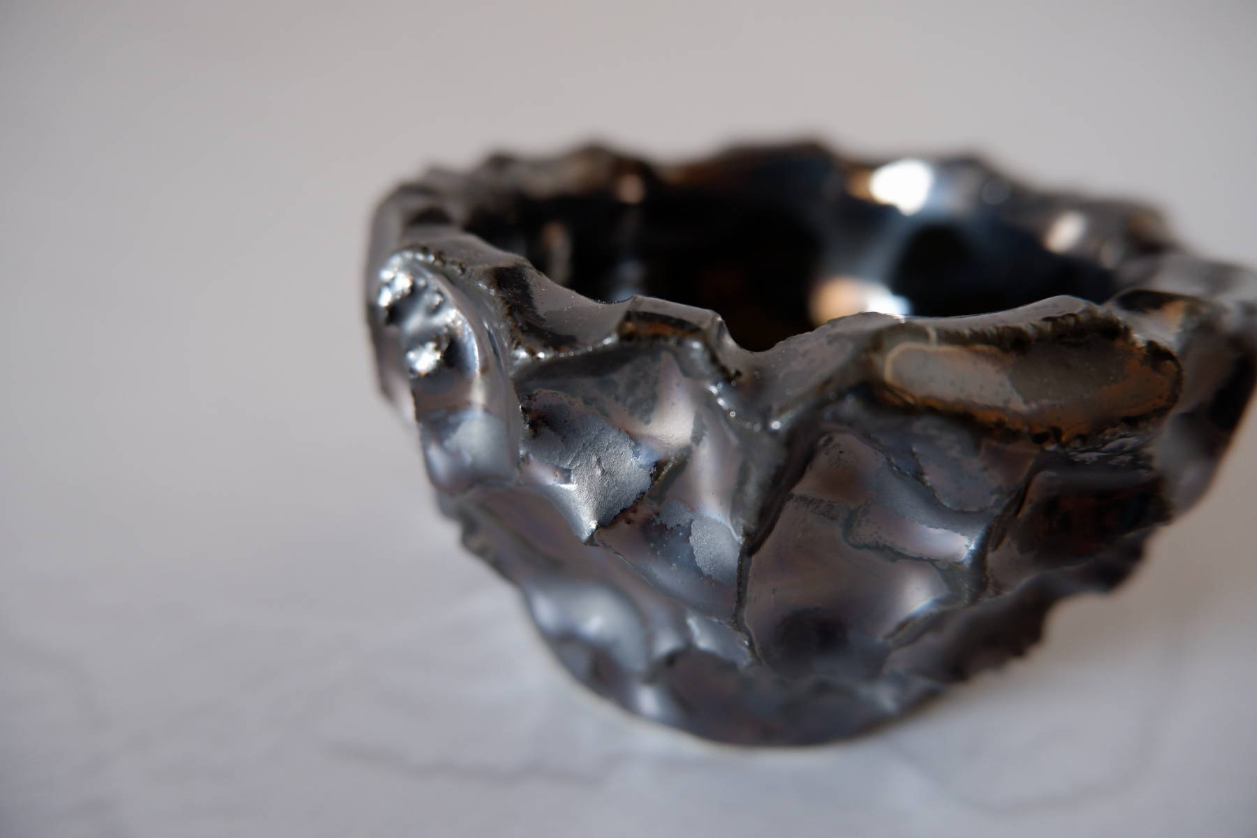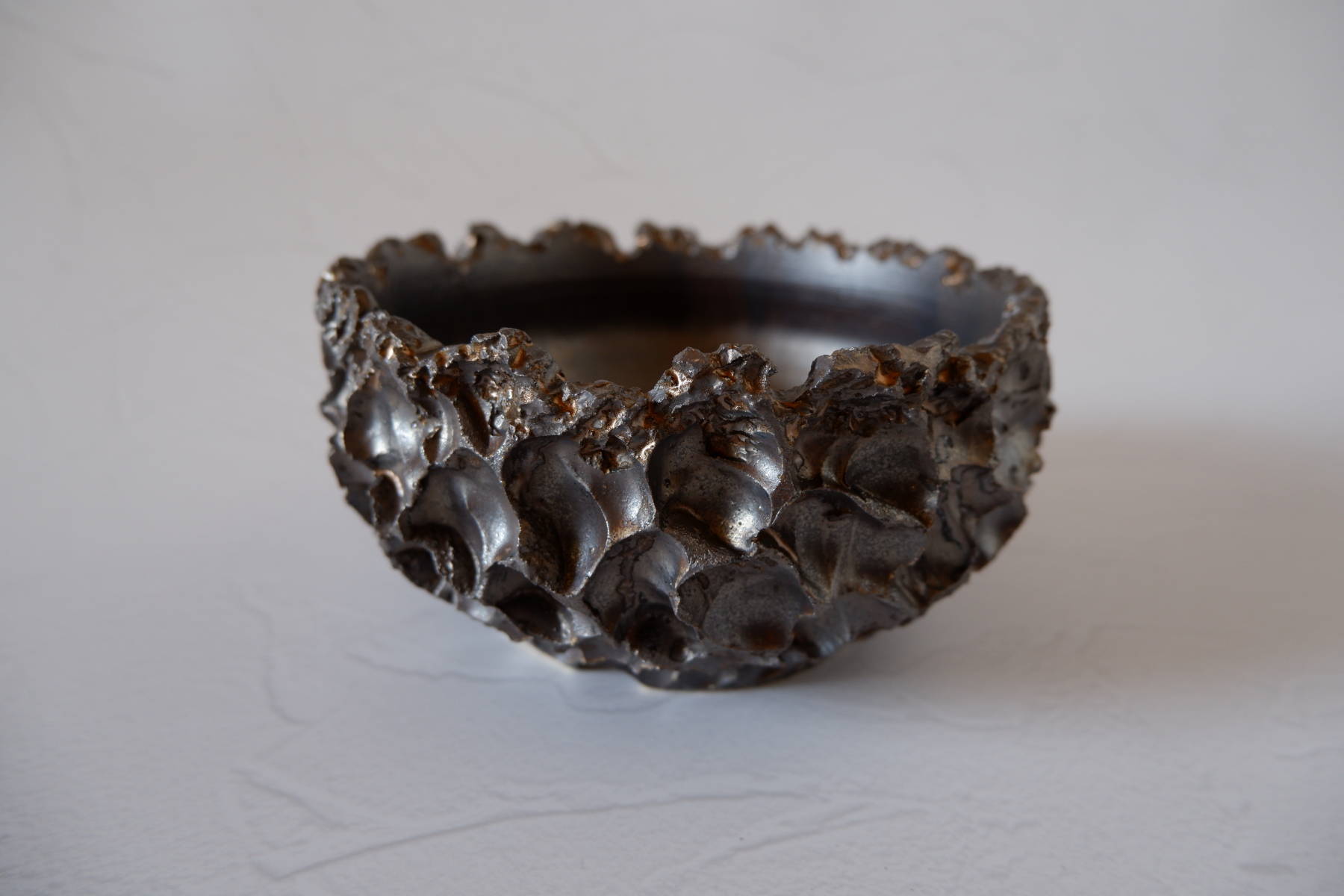 少し艶のある黒釉に金彩を勢いよく掛けた「金彩掛け艶流紋黒」と、錆びた鉄のような茶色の地の上に緑青のような青色を重ねた「青錆」です。
