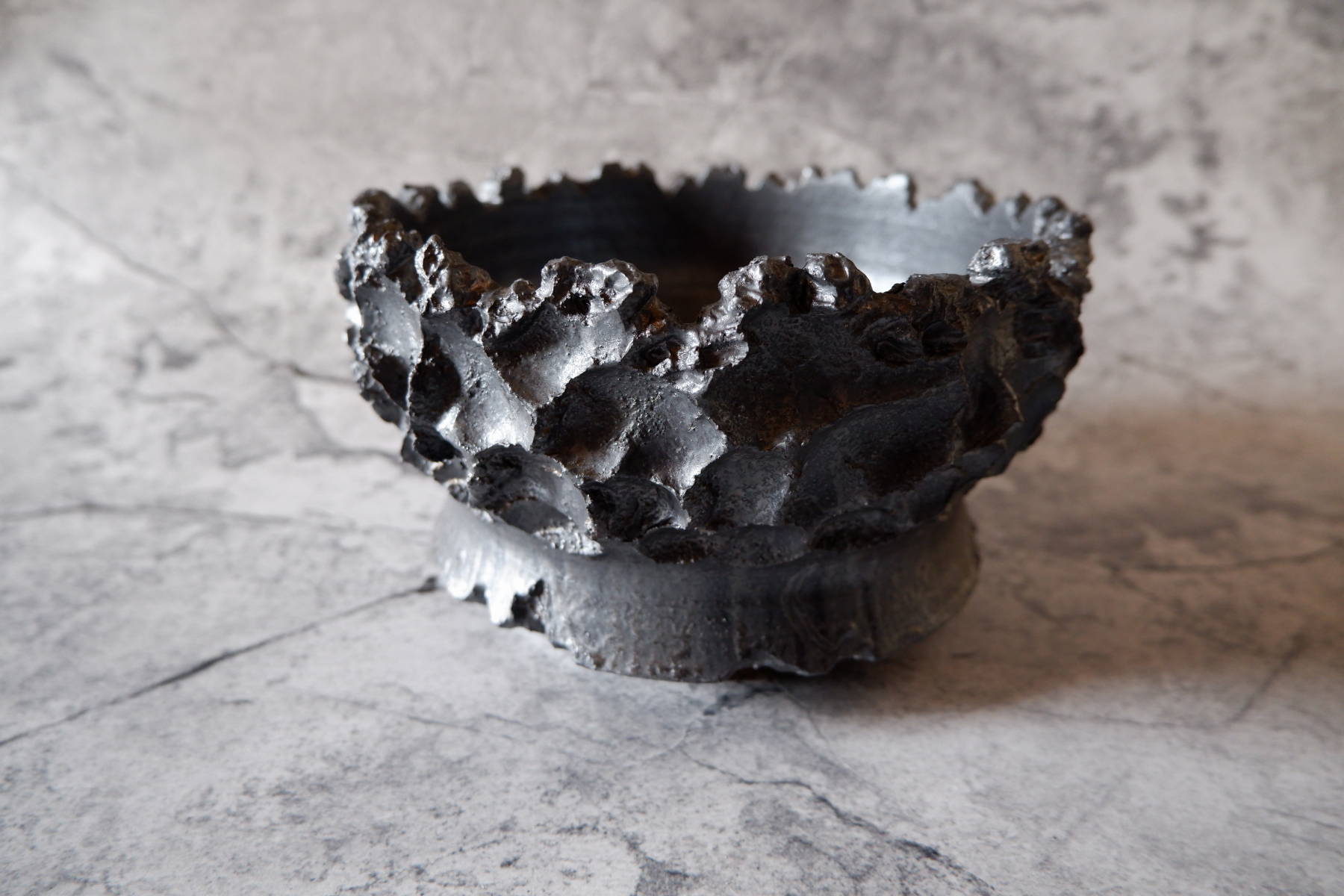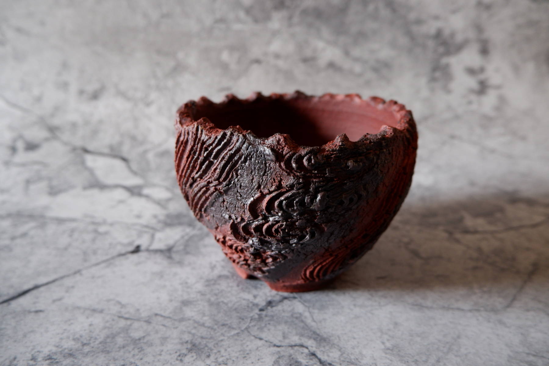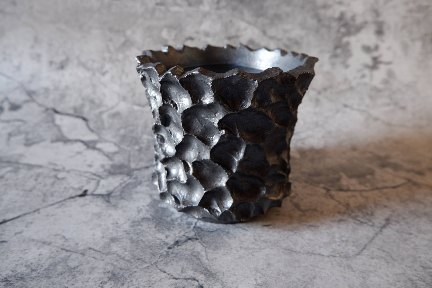 鉢の化粧土としても用いられる富士砂の大粒、中粒を練り込んだ黒土に、溶岩のような気泡が出る釉薬を部分掛けした、手捻りの鉢です。