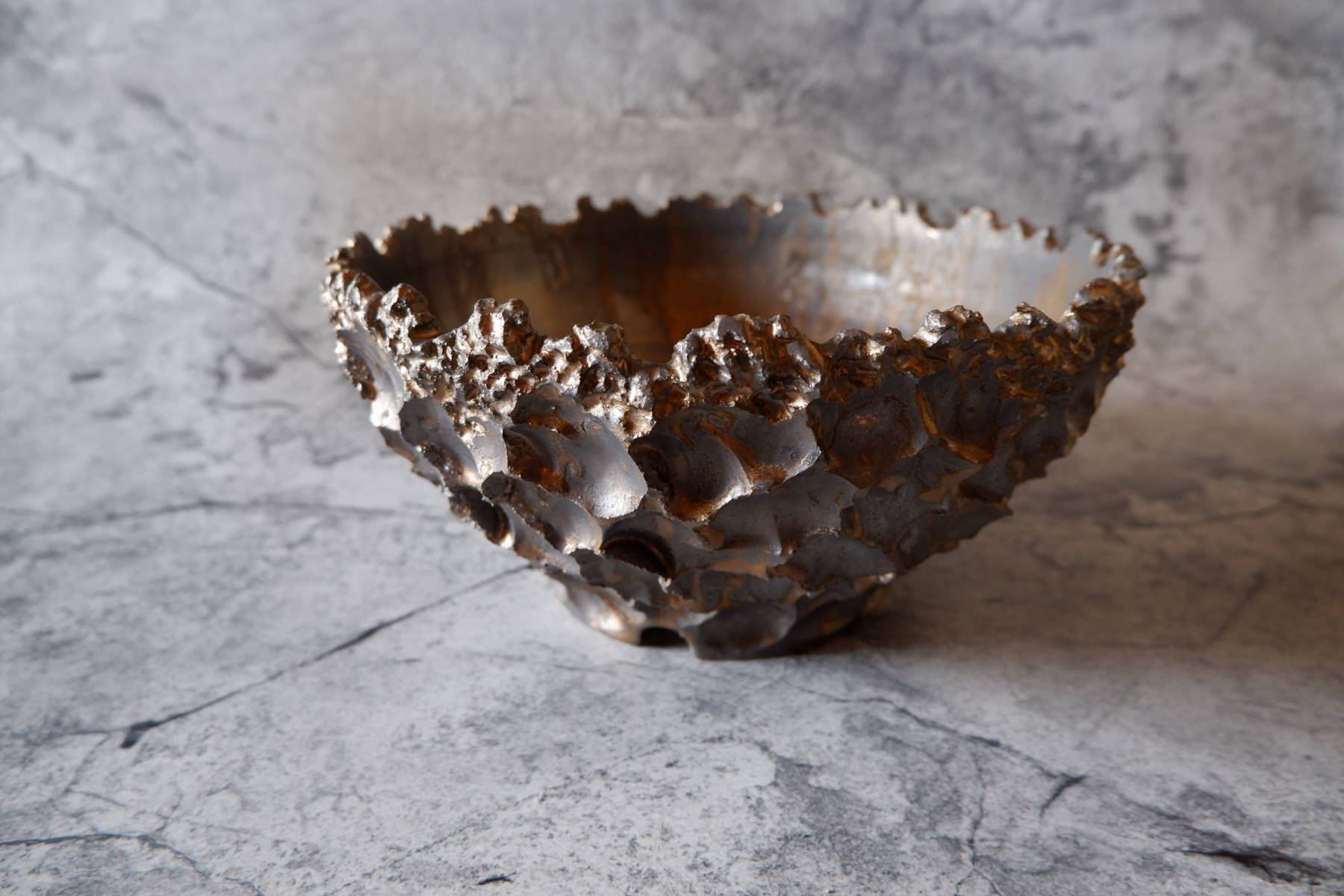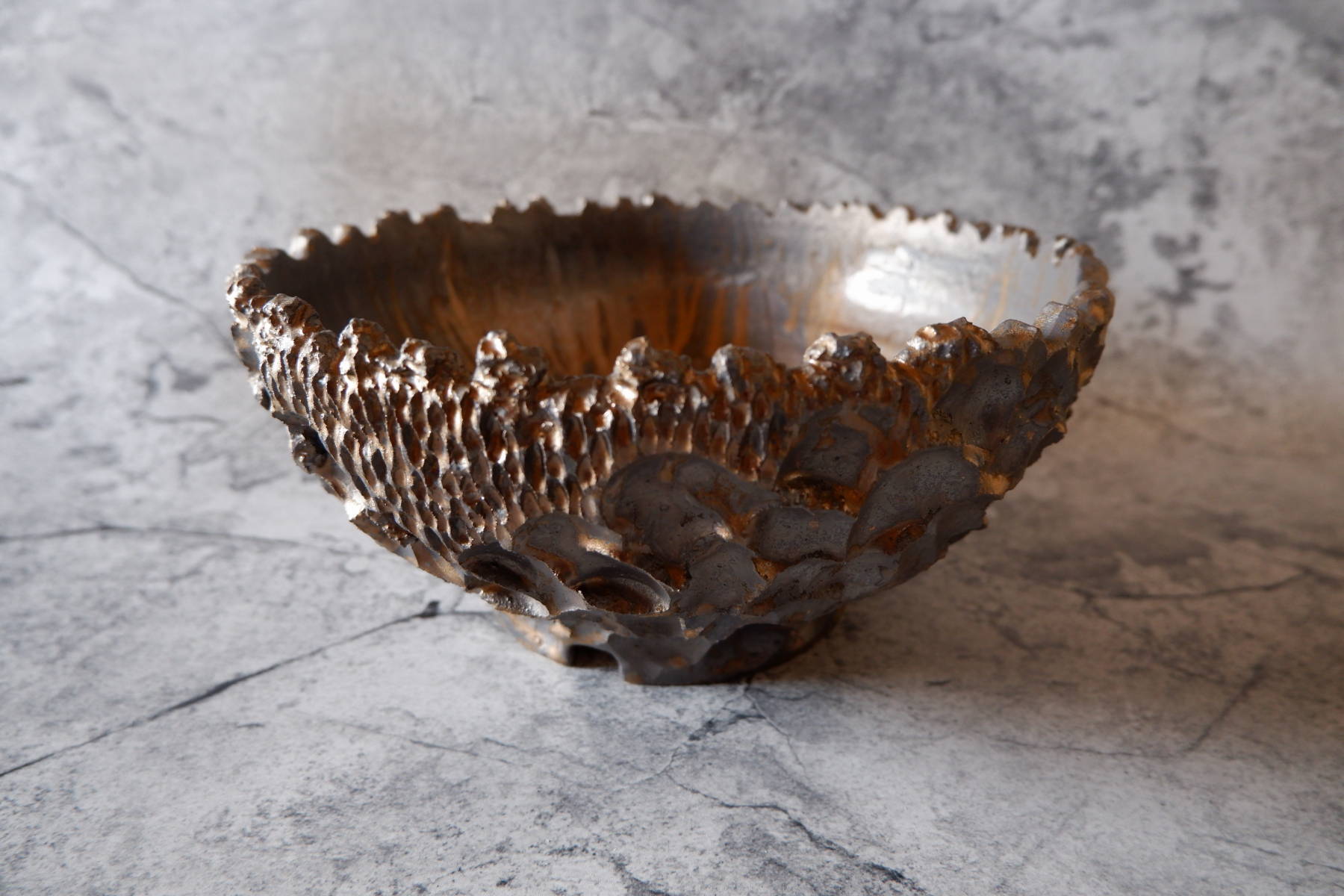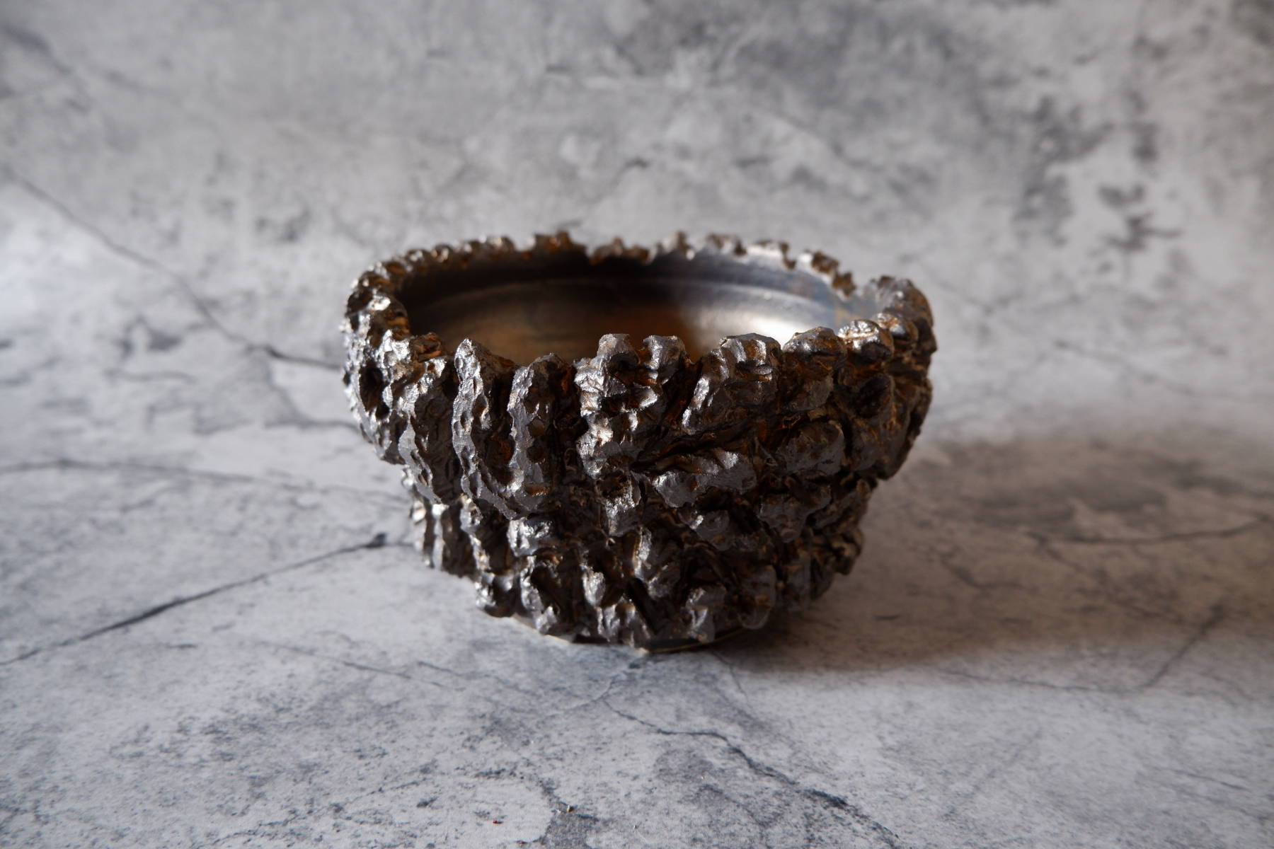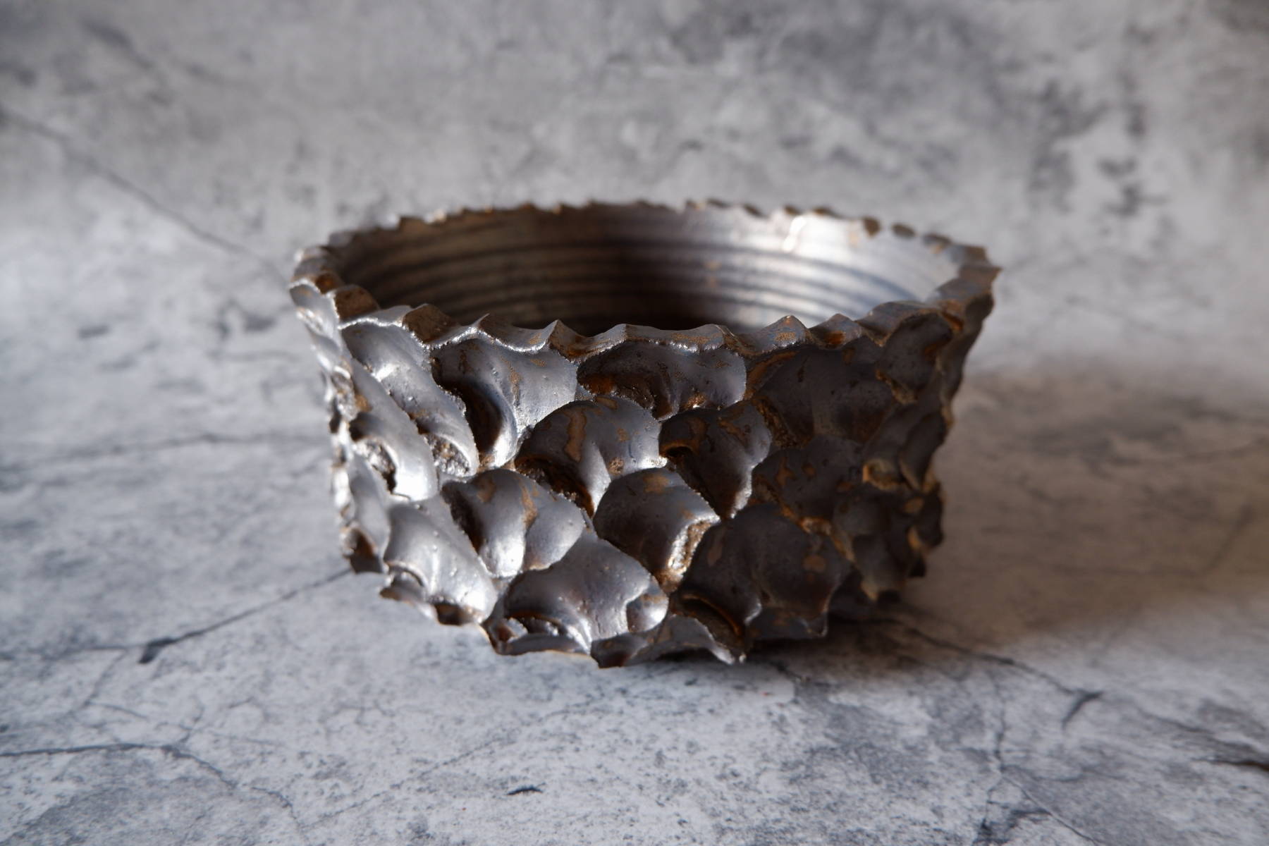 鉢の化粧土としても用いられる富士砂の大粒、中粒を練り込んだ黒土に、溶岩のような気泡が出る釉薬を部分掛けした、手捻りの鉢です。