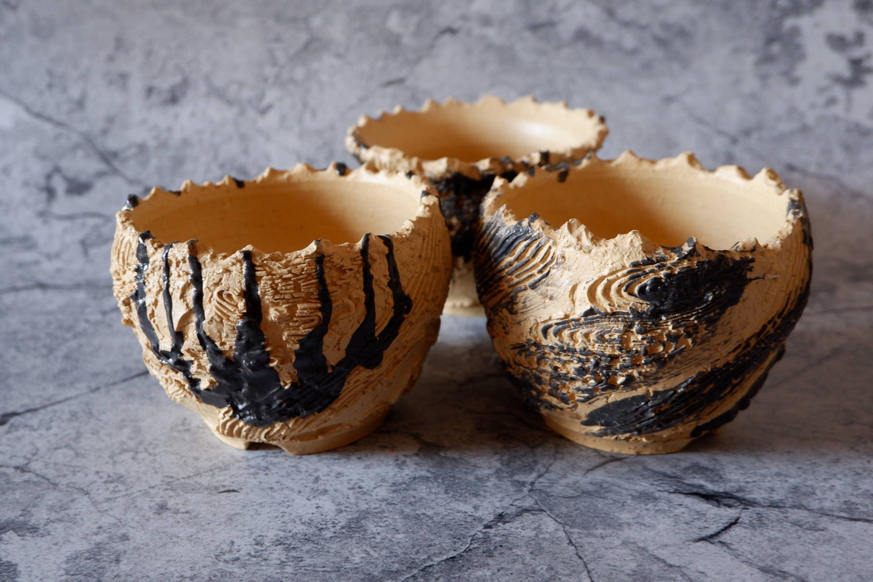 黄色い土と黒化粧土で捻り裂紋鉢と模様鉢を作りました。