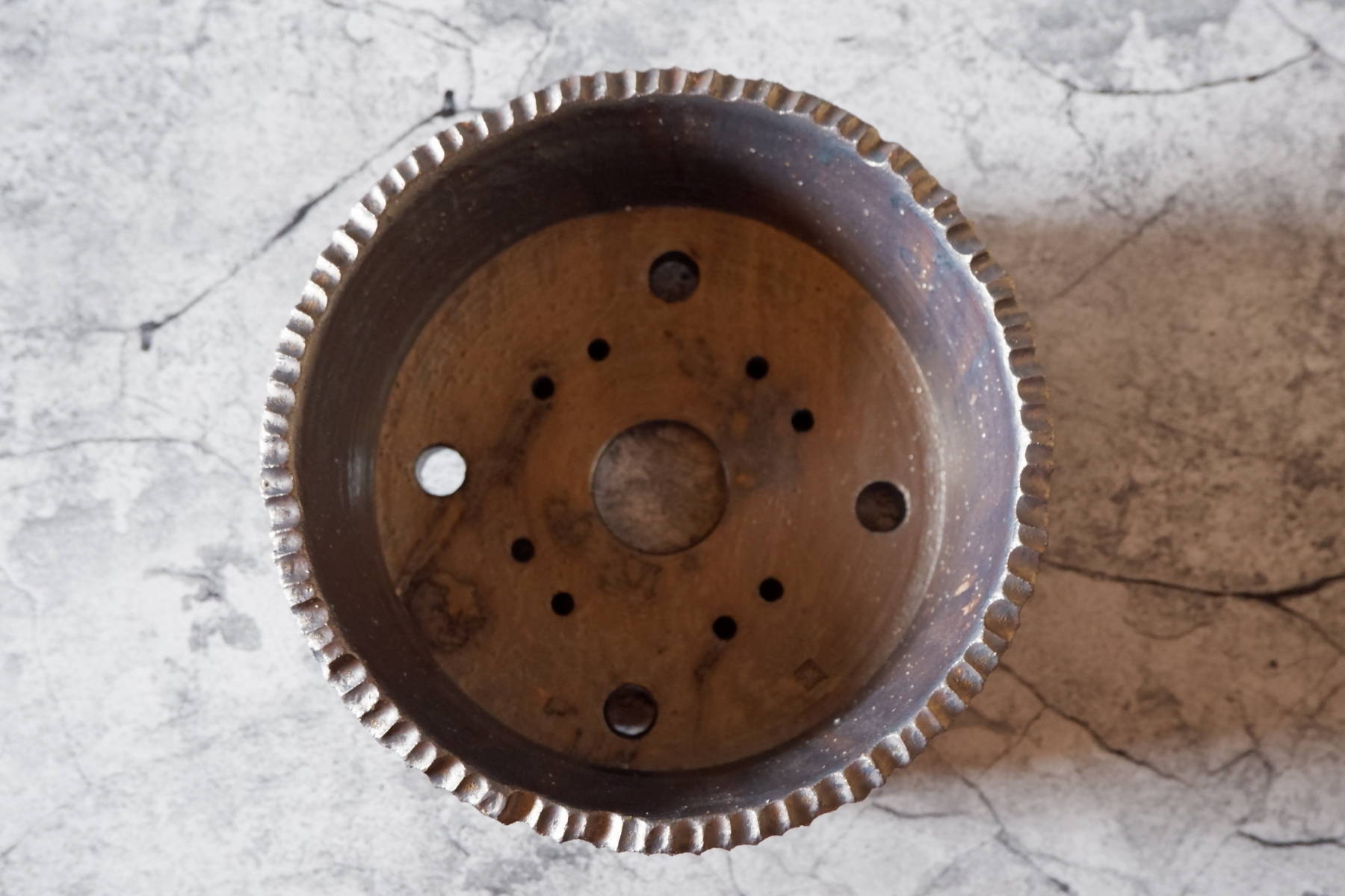 排水用に中央の大穴とその周囲に4つ、大穴の四方に針金用の小穴を4つ。