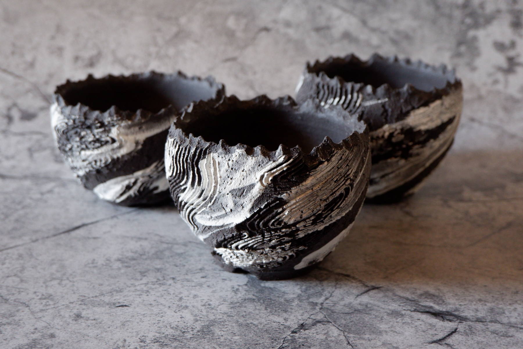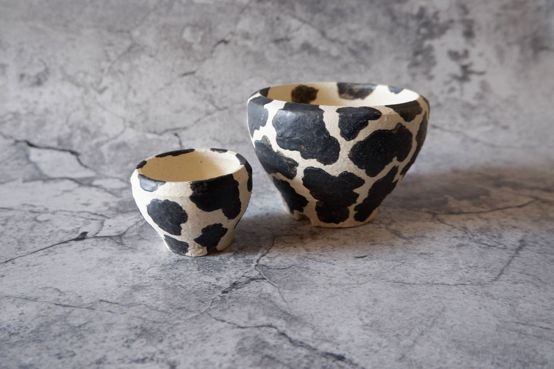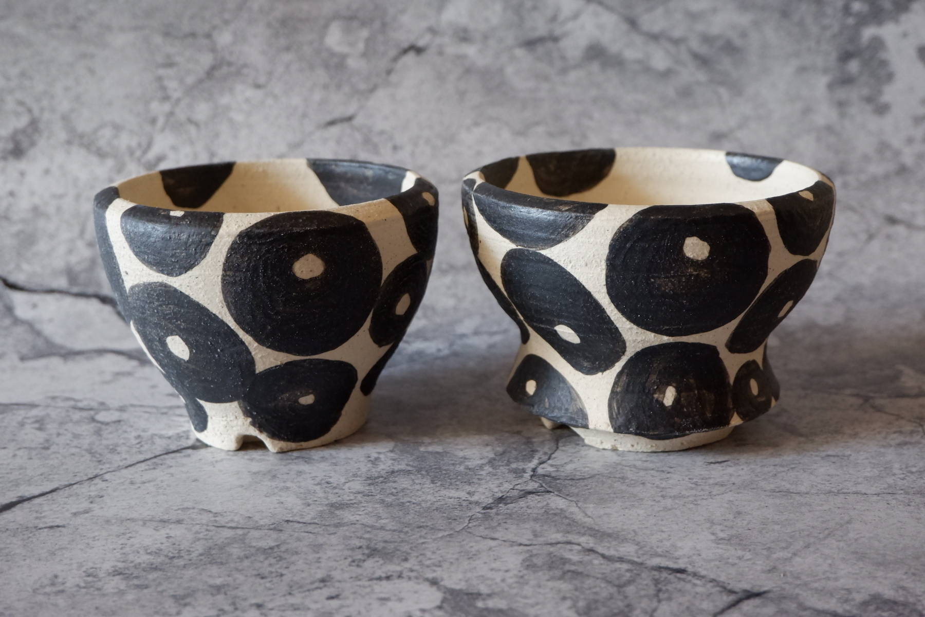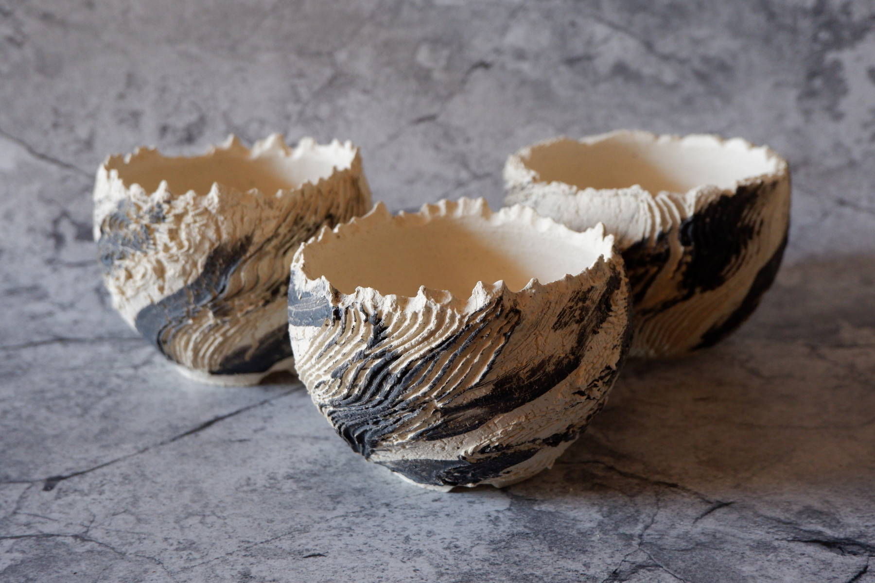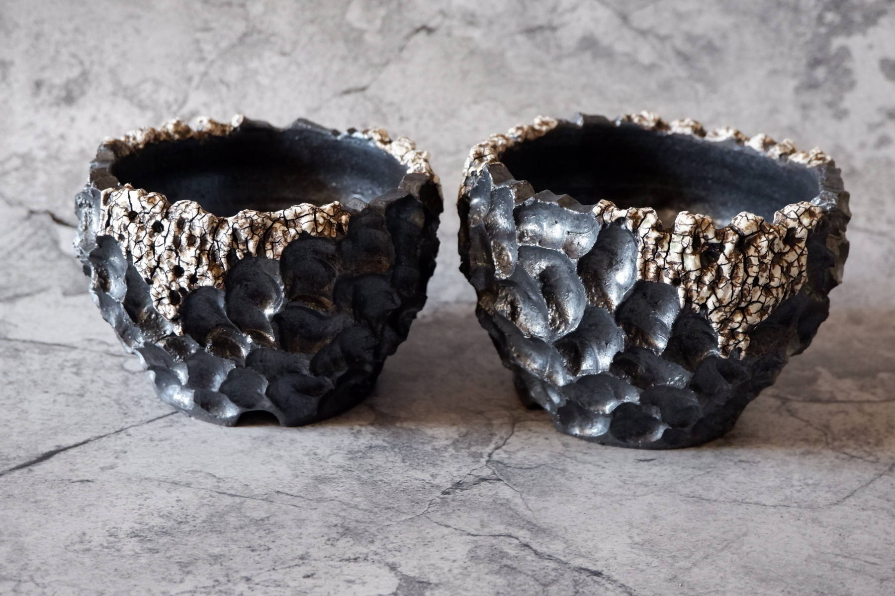ご好評いただいております、捻りを加えた裂紋に化粧土を掛けた「捻り裂紋鉢」を、今回は白と黒の2種類作りました。