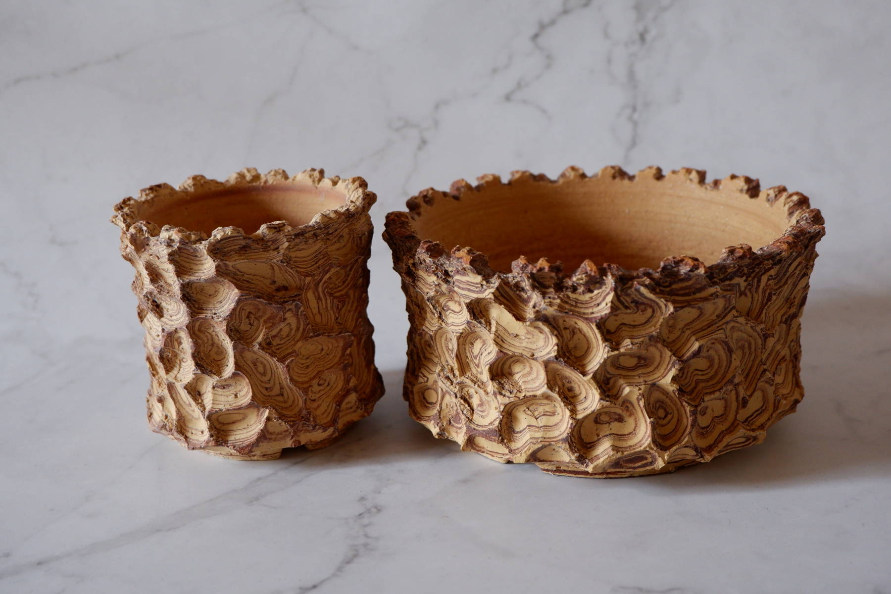 分厚く轢いた形に深い溝を彫り、鎬の部分を指で摘まんで更に引き上げたり、幾何学的でもあり有機的でもあるような模様を全体に施しました。