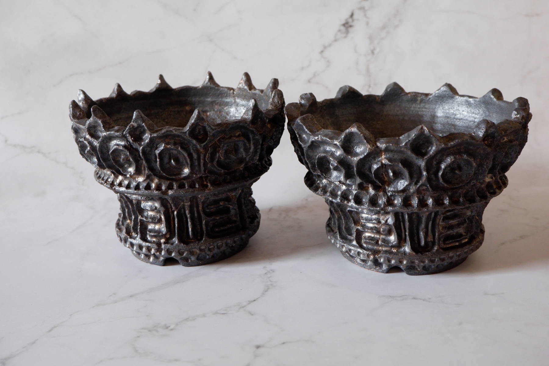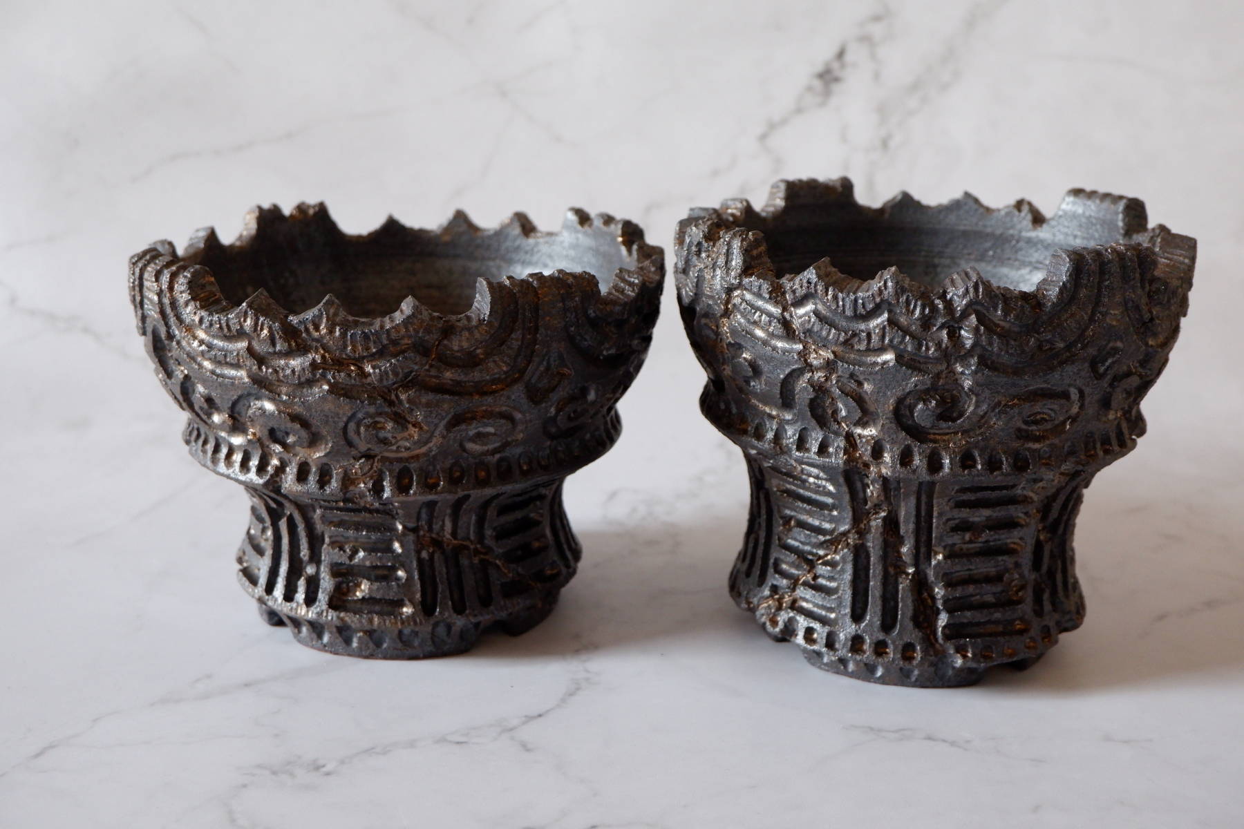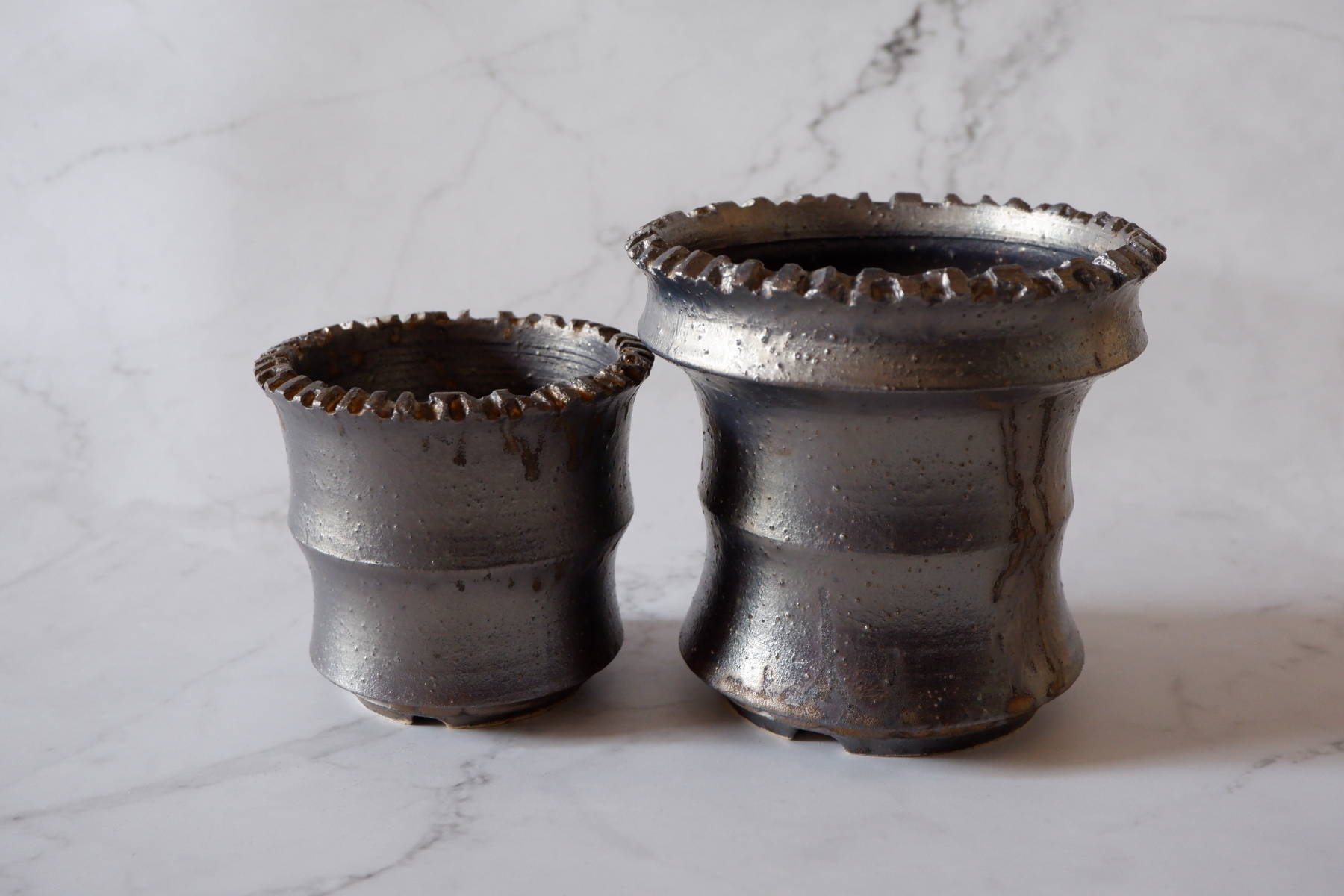 全体を渋い金属感の出る黒釉で仕上げましたので、古代感を漂わせる佇まいになったと思っています。