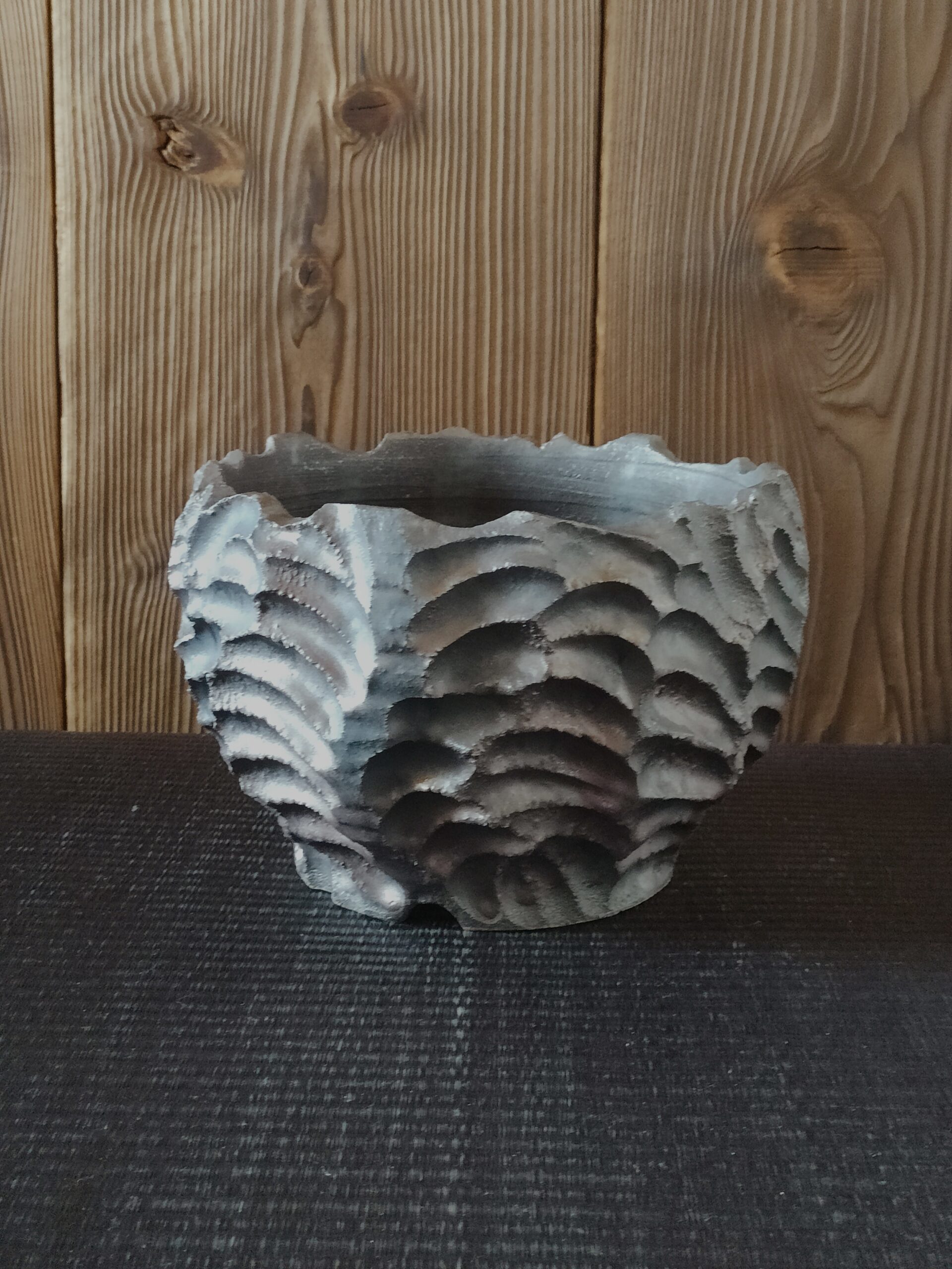 かなり厚く轢いて、深く削って、できたヒダをむしり取って形にしました。