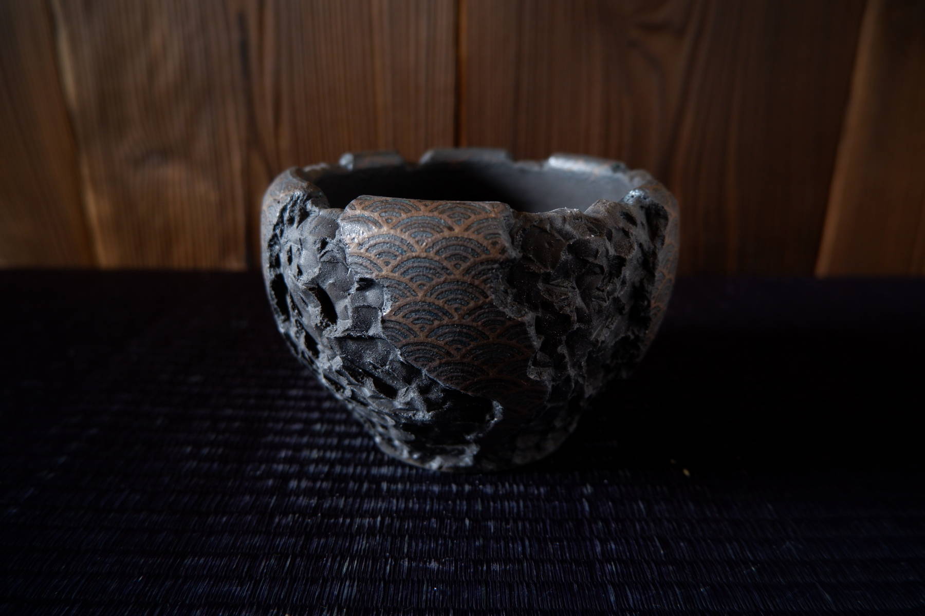 ブロンズ色の青海波は黒土の上では渋い発色になって、目立たない分粋な感じです。