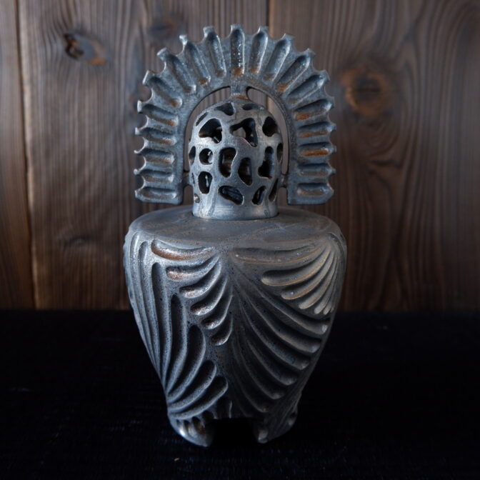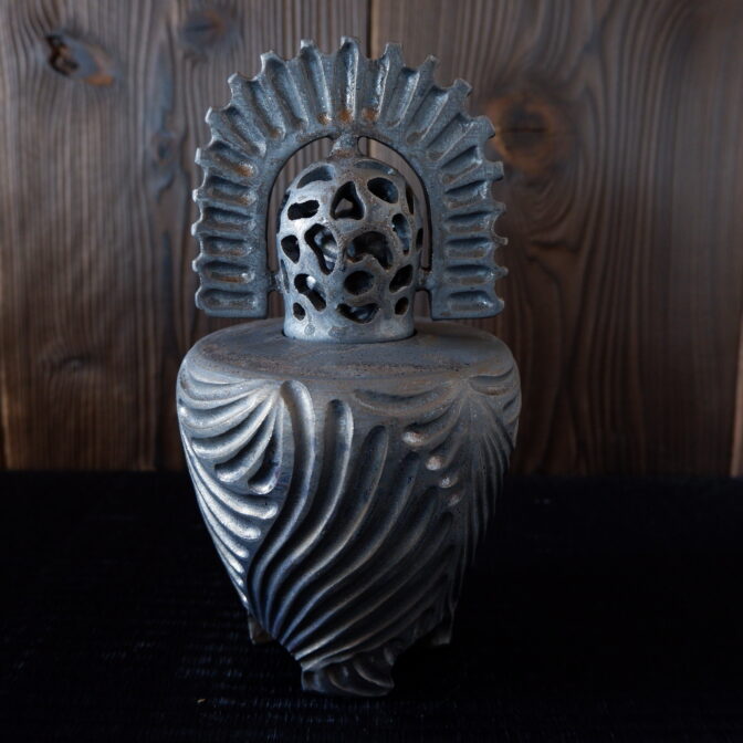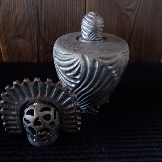 全体を燻したような錆びたような金属的な色あいの釉薬で仕上げています。