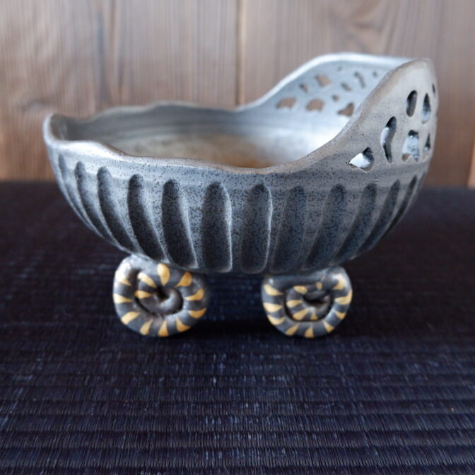 ハロウィンを意識して、陶器に透かし彫りを施した黒いベビーカーを作りました。