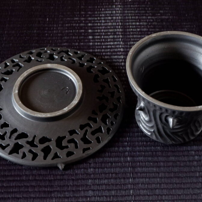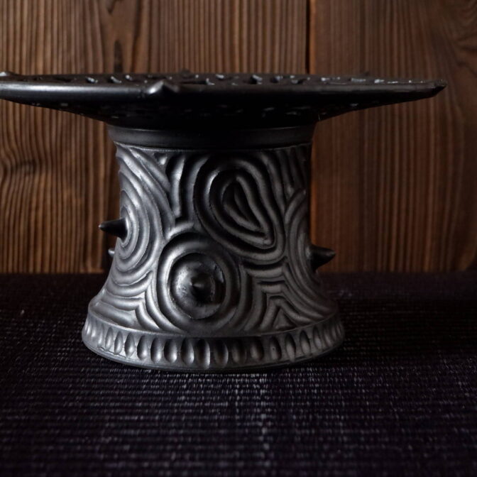 上皿の周囲に透かし彫りを施し、台には彫模様、上皿の縁と台にトゲトゲを加えました。