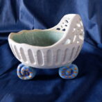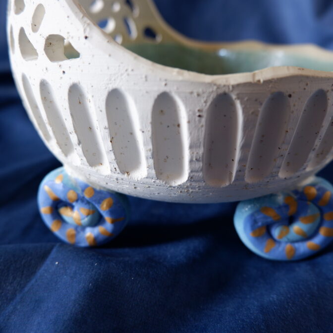 車輪はトルコブルーのカラー粘土にゴールドの上絵の具で模様を加えました。