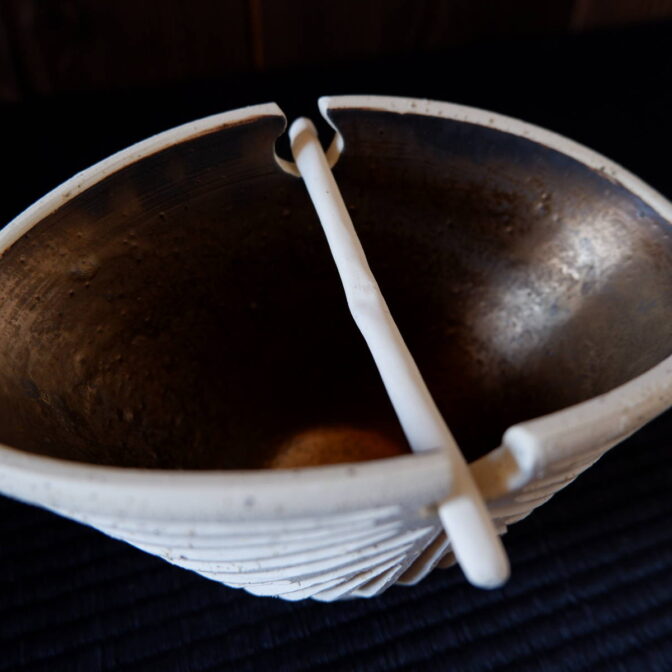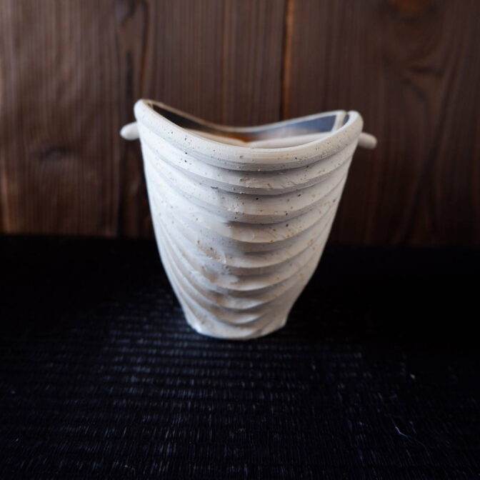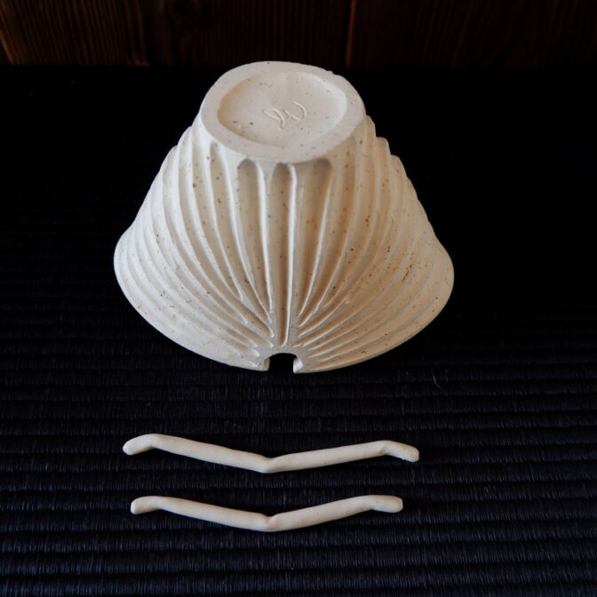 真っ白な陶土に沖縄の海岸で採取した珊瑚砂を練り込んで、琉球石灰岩のような質感を表現しました(珊瑚砂の