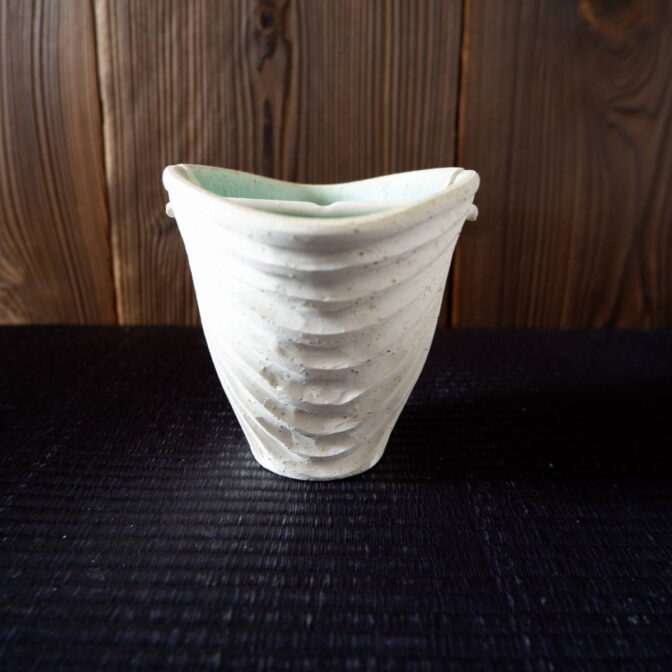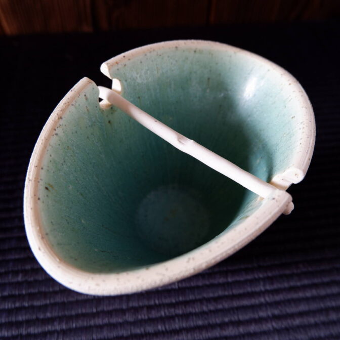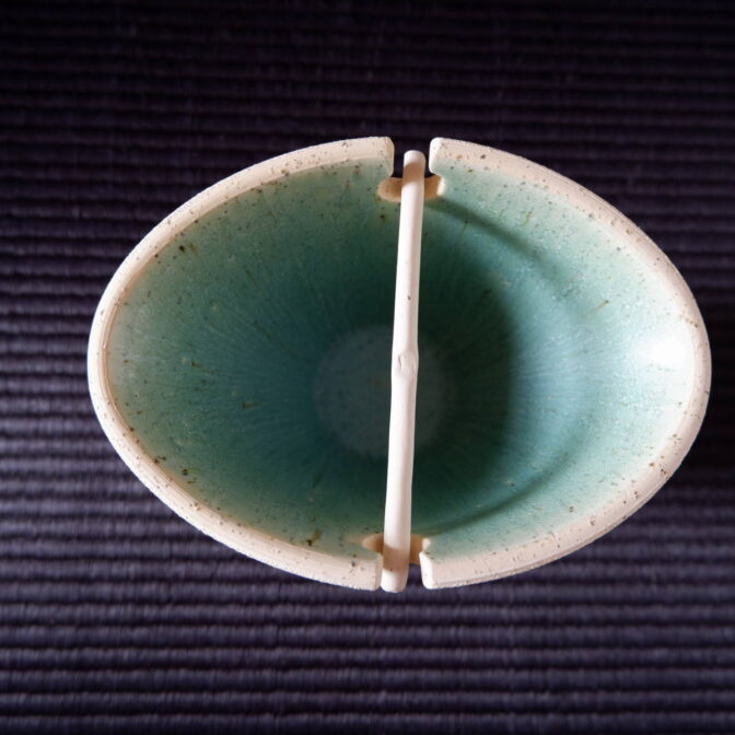 珊瑚砂の質感を残すために、ボディ外側には施薬せず、内側のみ光沢を抑えたブルーの釉薬を掛けました。