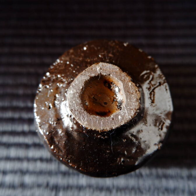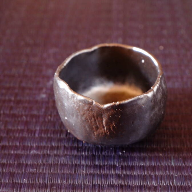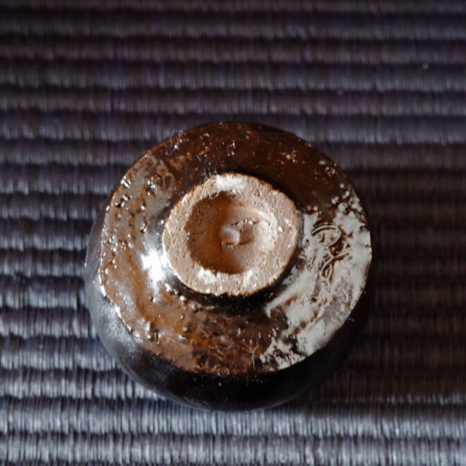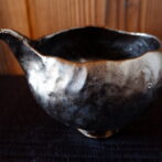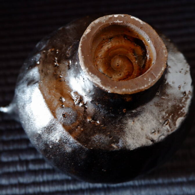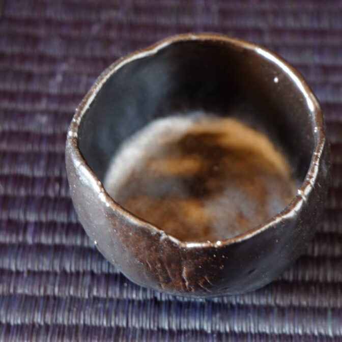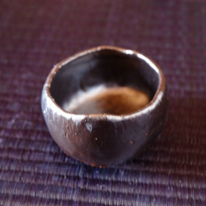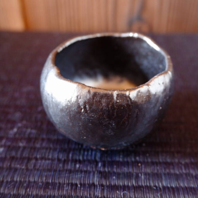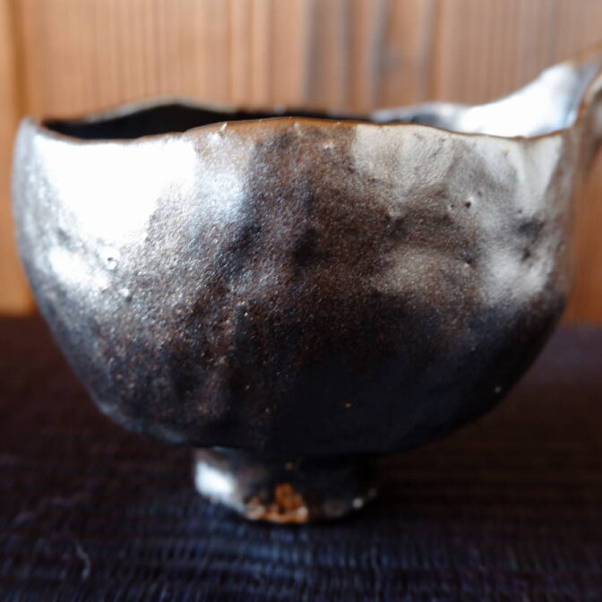 少し光沢のある流れる黒釉を掛けましたので、手捻りによる凹凸と光の当たり具合により異なる表情をお楽しみください。