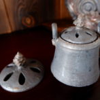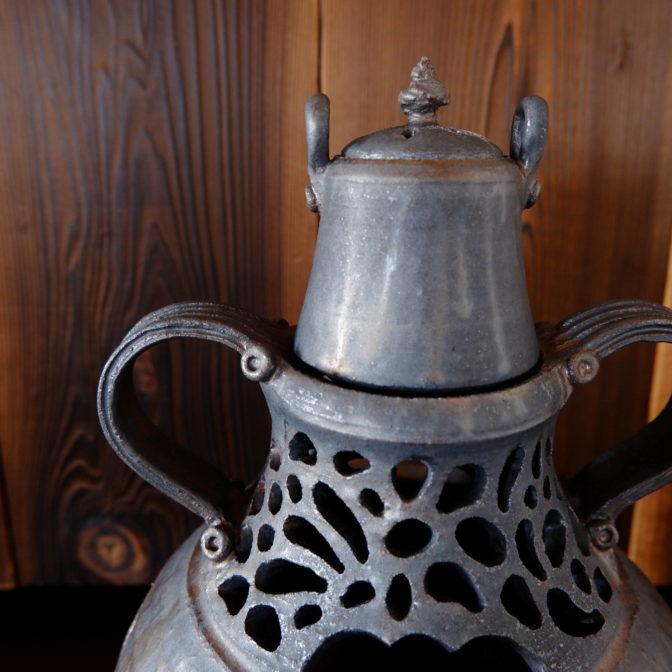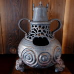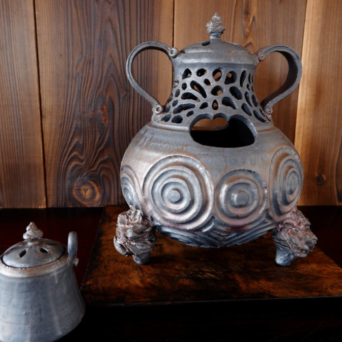 丁子風炉は、上の窯に乾燥させた丁子(クローブ)と水を入れ、下の炉に敷いた灰の上で炭を焚き、室内の芳香や傍に吊るした衣服に香りを移したりするのに使われます。