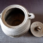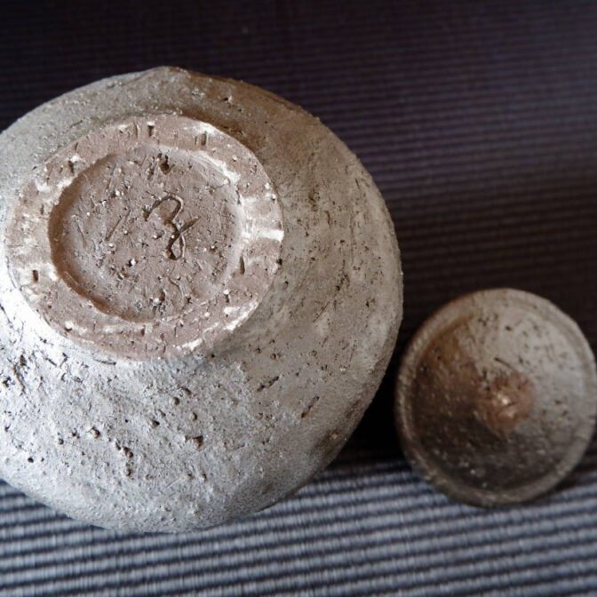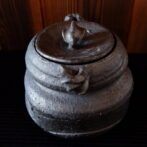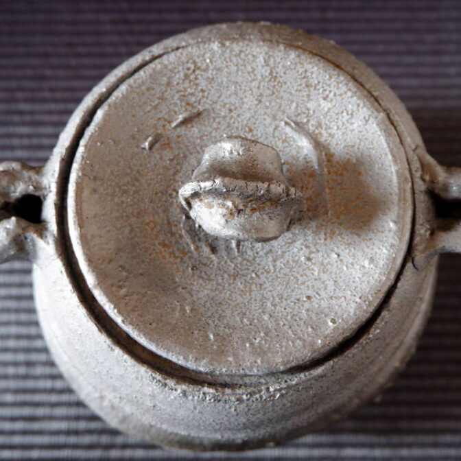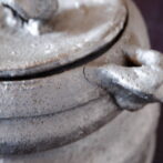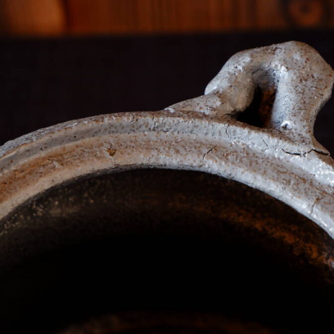 粗い土ゆえに耳の付け根や蓋の受け口縁に数か所小ヒビが出ました、機能や強度を損なう割れではありませんので、味わいの一つとしてお楽しみいただければと思います。