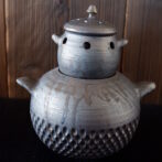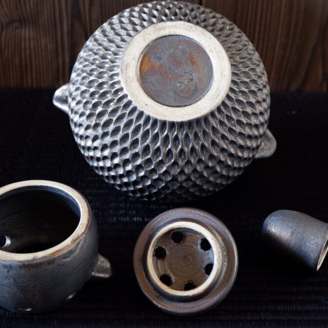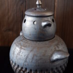 全体を燻したような、錆のような金属的な発色の釉薬で仕上げました。流れのある表情をお愉しみいただければ幸いです。