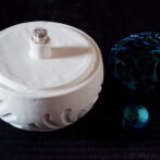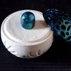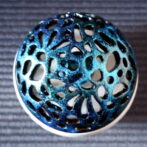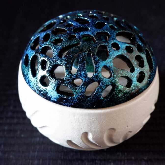 デコレーションキャップとサブキャップには黒釉で焼成後に漆を塗り、ブルーとグリーンのメタリックパウダーを蒔いて彩色しました。