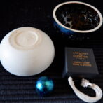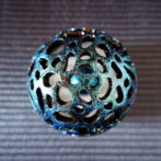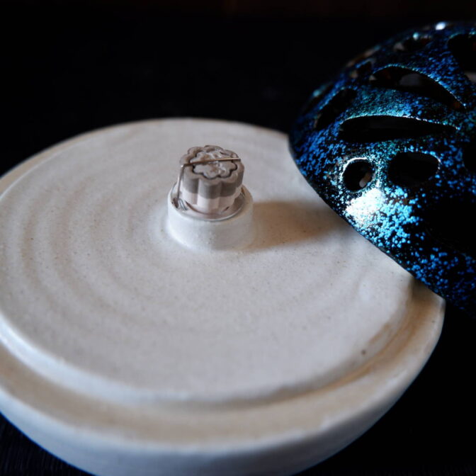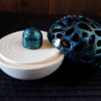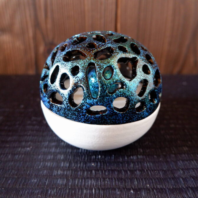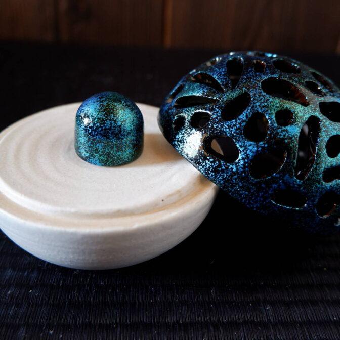 デコレーションキャップとサブキャップには黒釉で焼成後に漆を塗り、ブルーとグリーンのメタリックパウダーを蒔いて彩色しました。