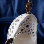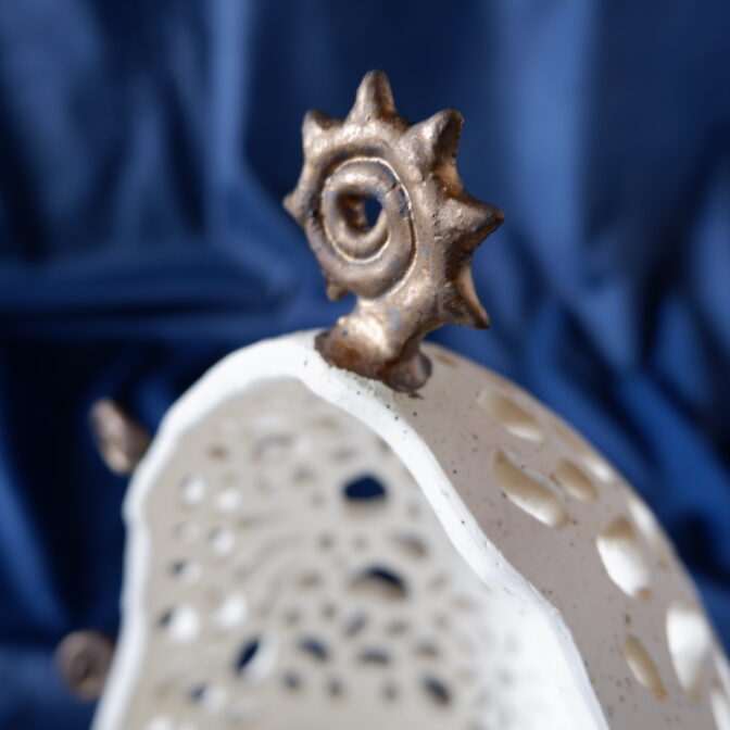 珊瑚砂の質感を残すために、ボディには施薬せず、トップと再度の突起と脚のみに光沢を抑えた金彩の釉薬を掛けました。