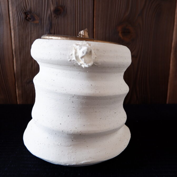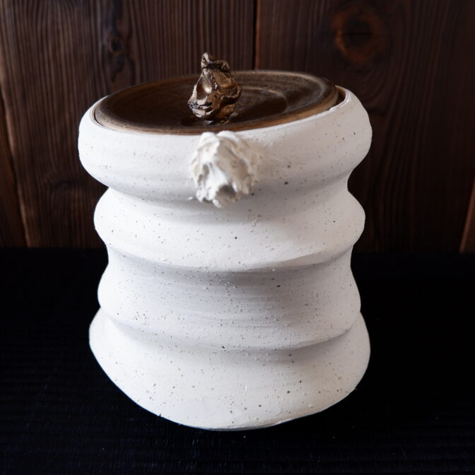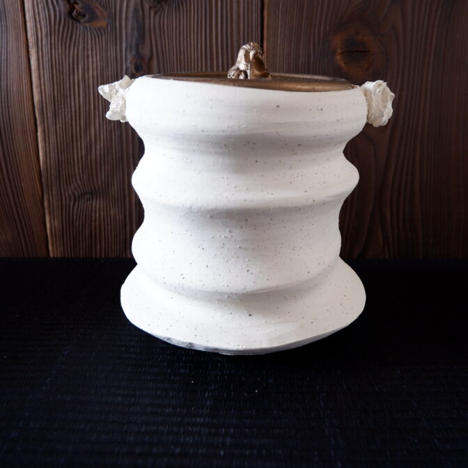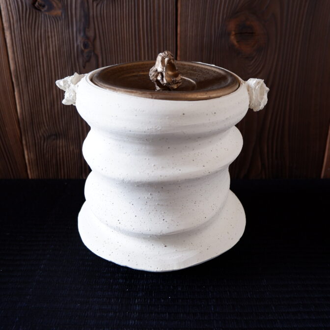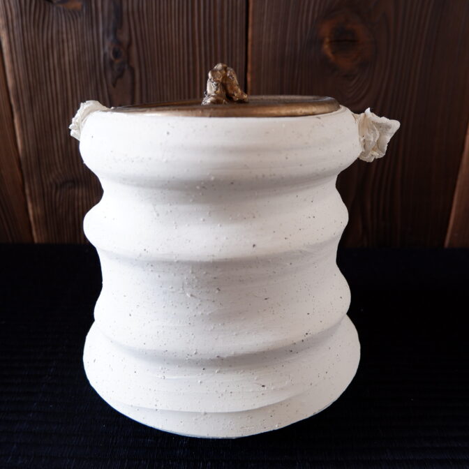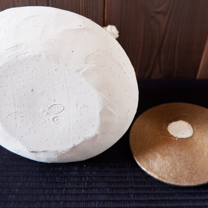 別売のテーブル火鉢と一緒に卓上で行うようなカジュアルな茶事をイメージして、真っ白いボディに金彩の蓋を添えた少しポップな水指にしました。