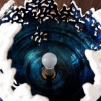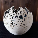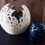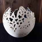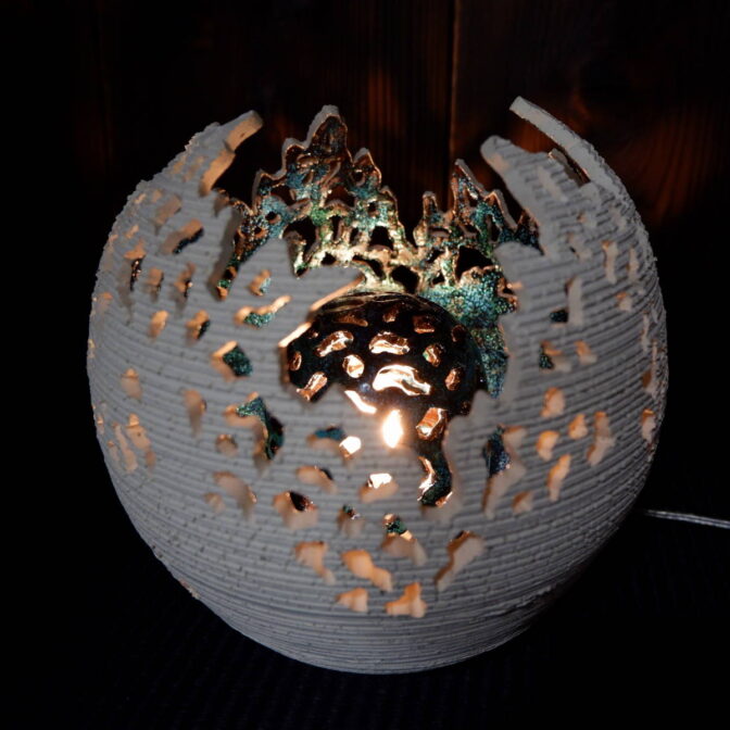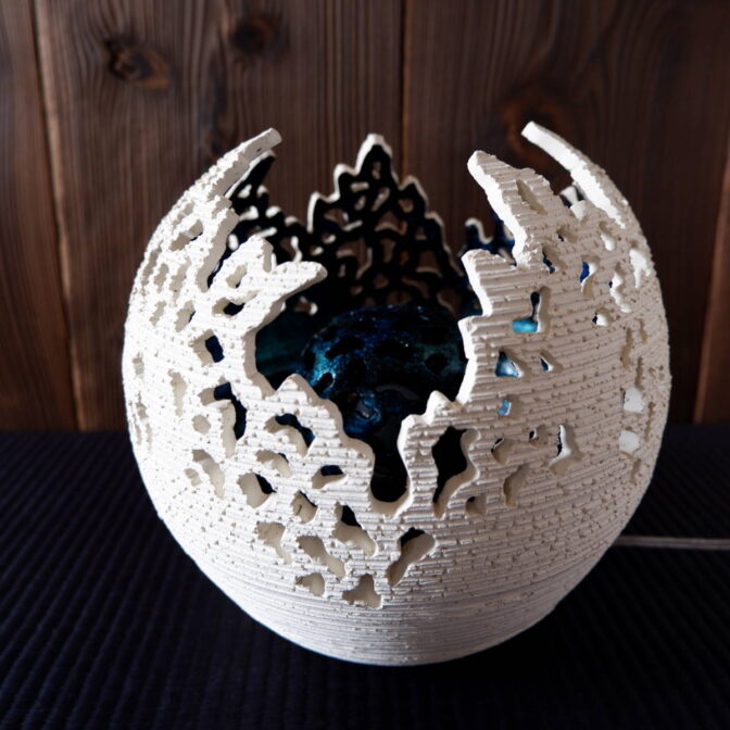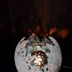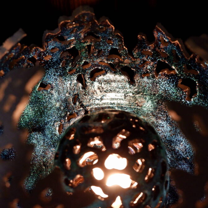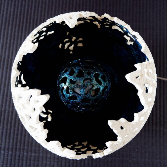 透かし彫りと裂紋(嘯裂文:しょうれつもん)、漆塗りを組み合わせた陶器製インテリアランプです。