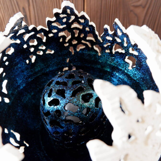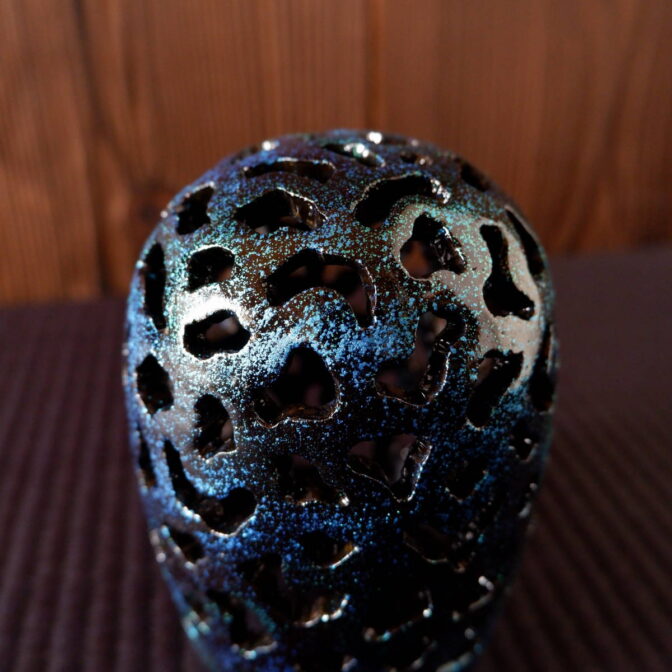 外側は細かいヒビ割れ模様の嘯裂文で覆い、内側には黒釉で焼成後に黒漆を塗り、その上からブルーとグリーンのメタリックパウダーを蒔いて着色しています。
