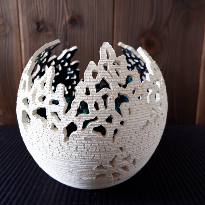 真っ白な陶土に沖縄の海岸で採取した天然の珊瑚砂を練り込んで、琉球石灰岩のような質感を表現しました(珊瑚砂の採取につきましては、沖縄県土木事務所の許可を得ています)。