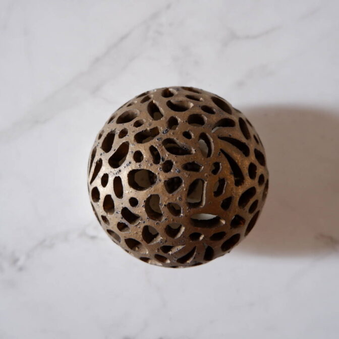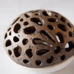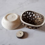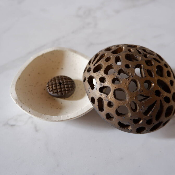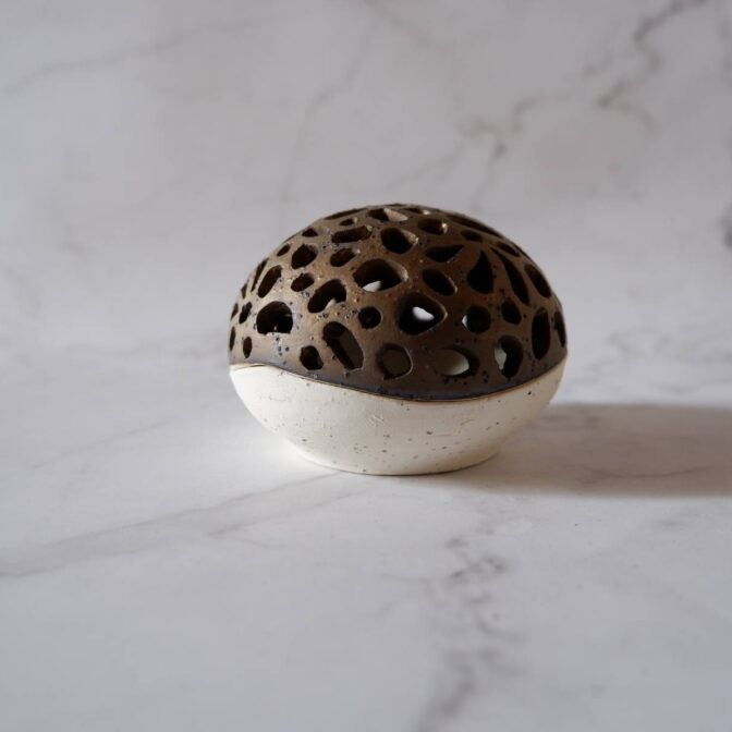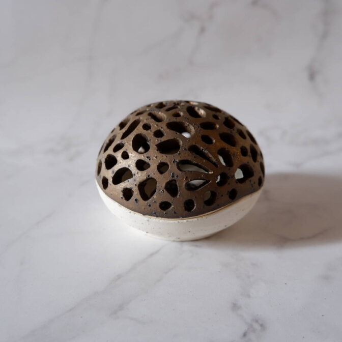 ボディの下側は白土の質感をそのまま生かすために施薬せず、透かし彫りを施した上蓋には光沢を抑えた金彩の釉薬を施薬しています。