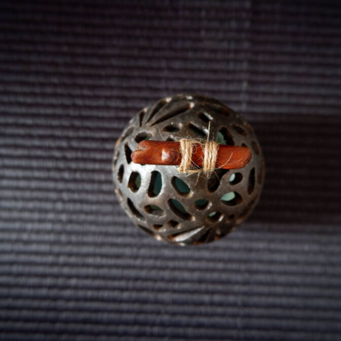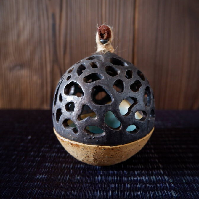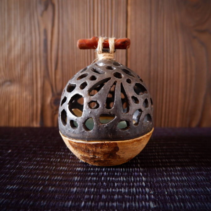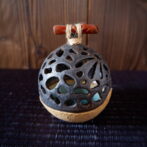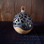 透かし彫りを施した蓋に流木の取っ手を付けた陶器製の香立てです。