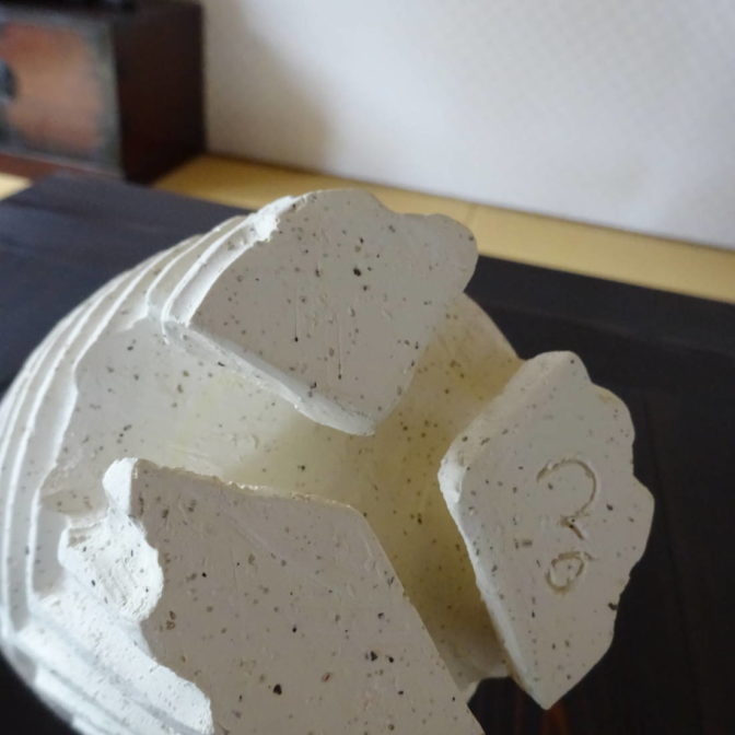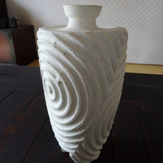 白い陶土に沖縄の海岸で採取した珊瑚砂を練り込んで、琉球石灰岩のようなザクっとした質感を出しました。