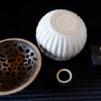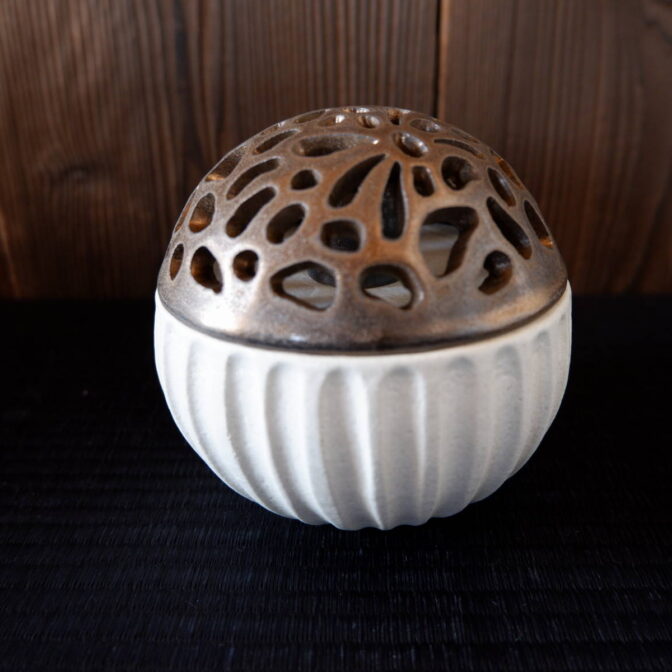 デコレーションキャップとサブキャップは金彩釉、ボディは鎬模様の上に白マット釉とエレガントな組み合わせにしました。