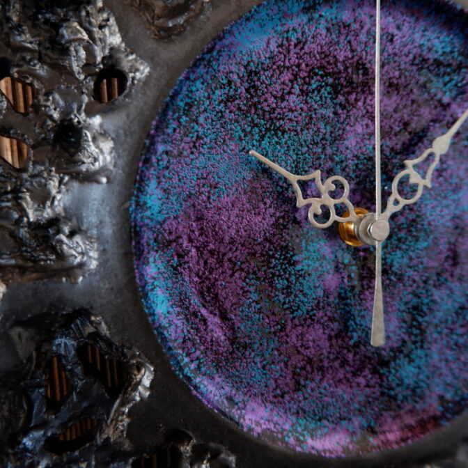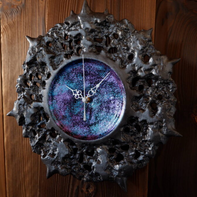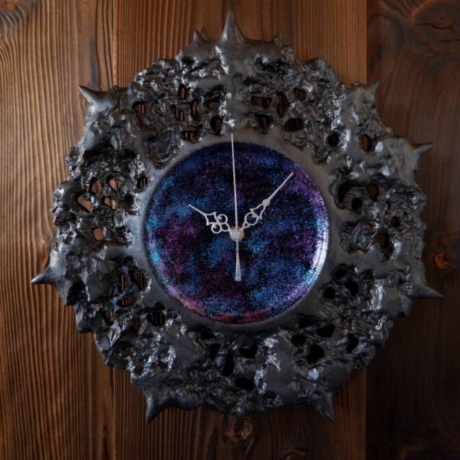 艶を抑えた黒釉で焼いた後に、中央部分に黒漆を塗りブルーとパープルのメタリックパウダーを蒔いて彩色しました。