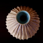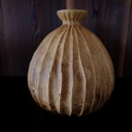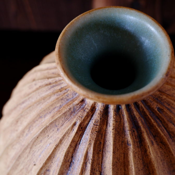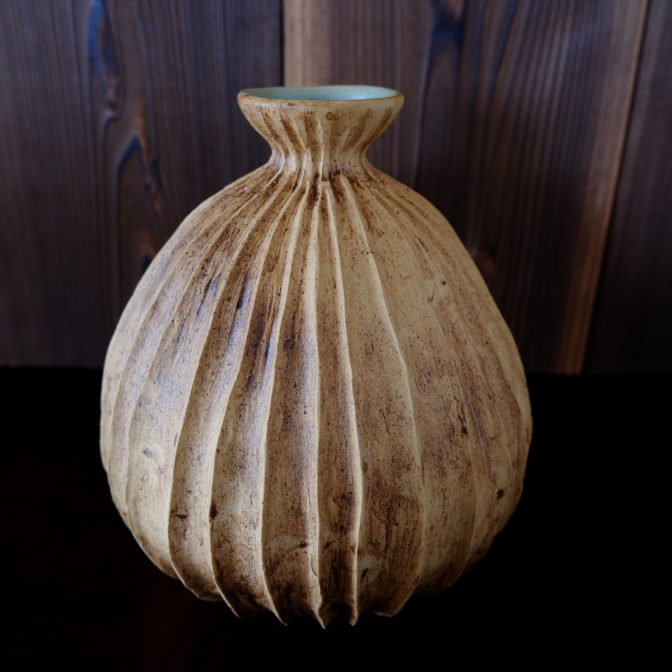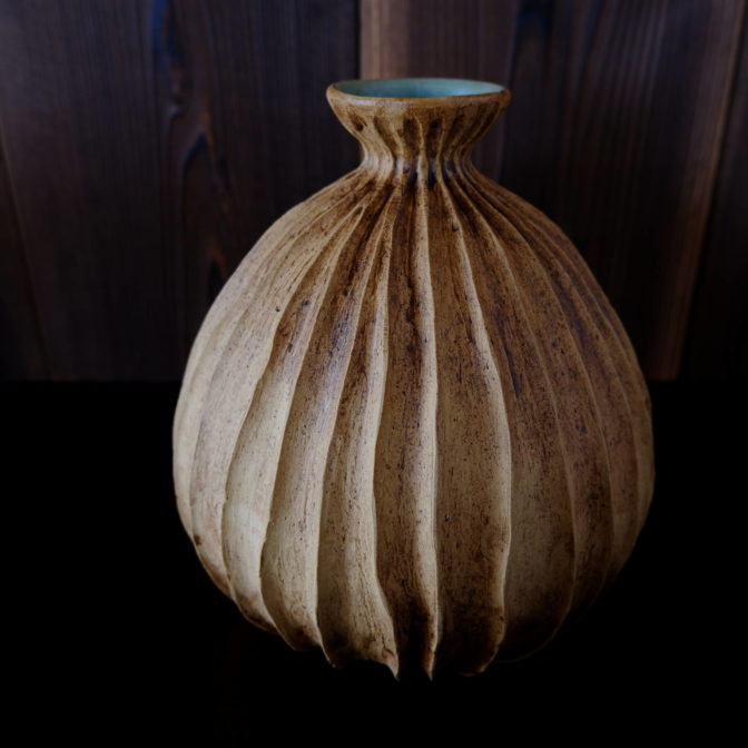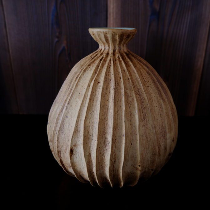 厚めにロクロ成形したものの表面をひだ状に削り出しました。