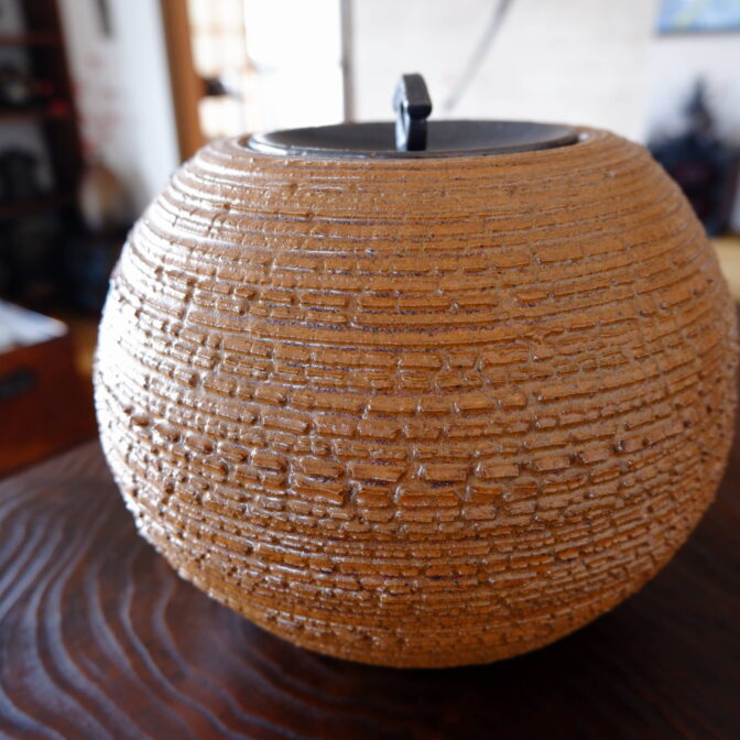 ボディに細かいひび割れの裂紋(嘯裂文:しょうれつもん)を施し、凹凸により濃淡が生まれる窯変釉を掛け、全体的には柿釉の様な発色になりました。