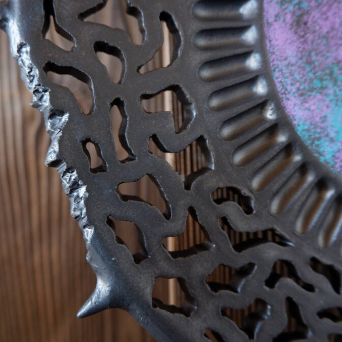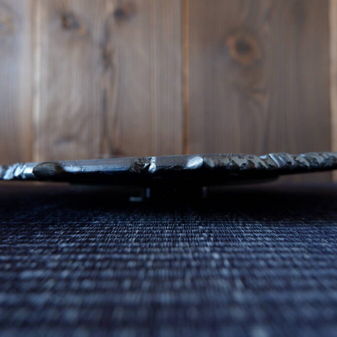 艶を抑えた黒釉で焼いた後に、中央部分に黒漆を塗りブルーとパープルのメタリックパウダーを蒔いて彩色しました。