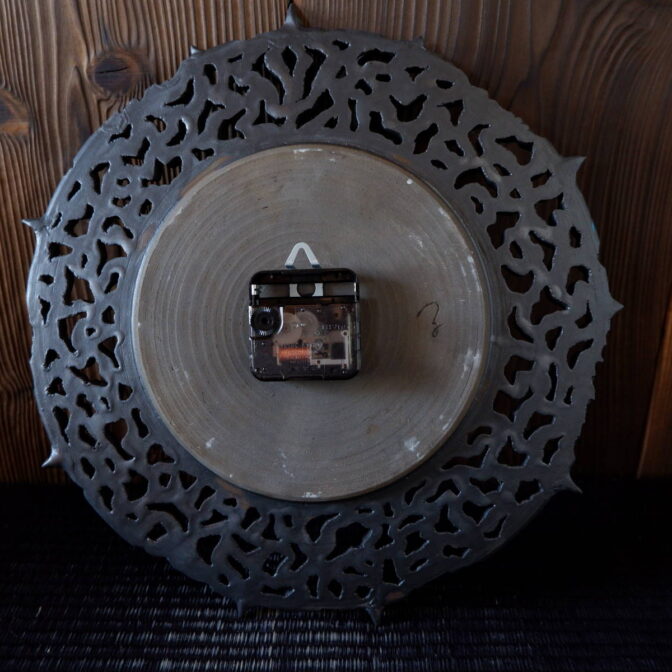 透かし彫りと漆塗りを施した壁掛け時計です。